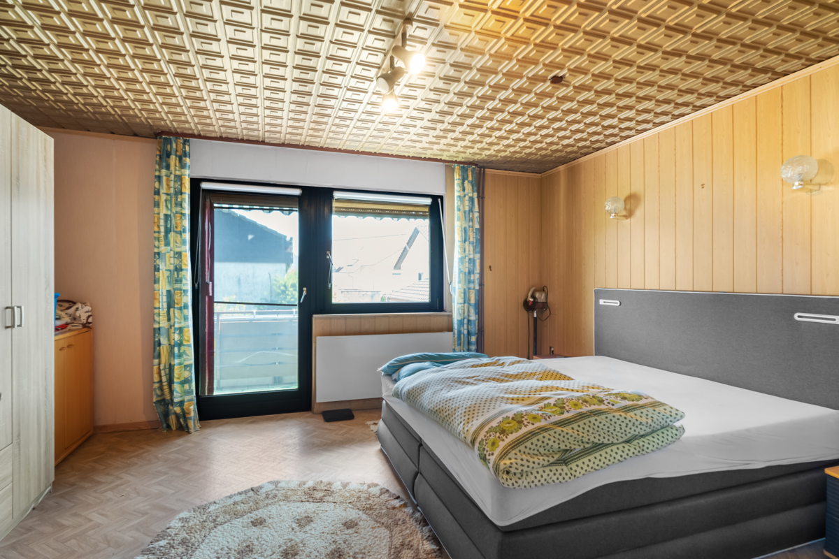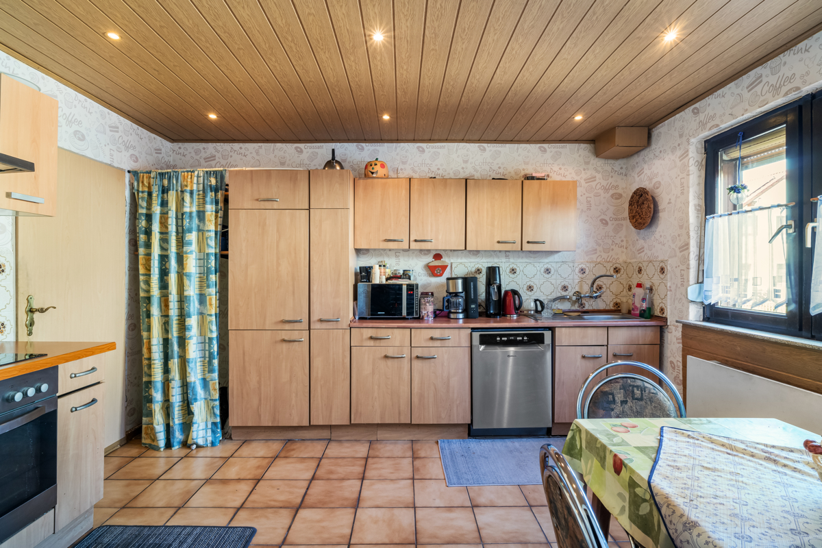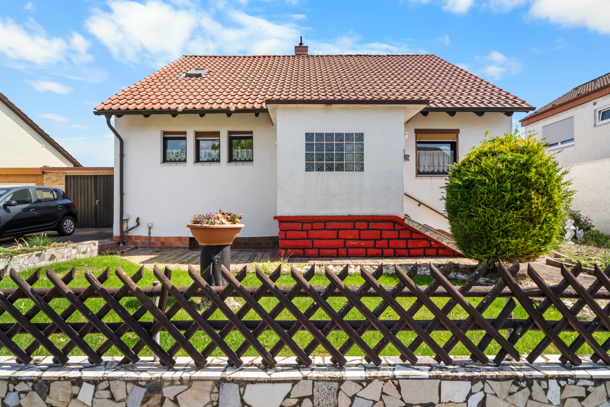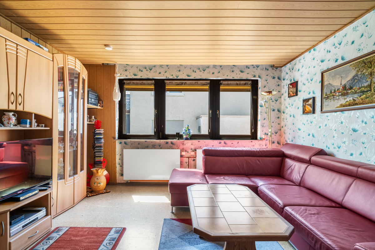 Die Aufteilung ist übersichtlich: eine geräumige Wohnküche, daneben das Schlafzimmer mit direktem Zugang zum Balkon, ein Wohnzimmer, ein Esszimmer, ein Tageslichtbad sowie ein Eingangsbereich mit vorgelagertem Windfang. Im Dachgeschoss stehen zwei weitere Räume zur Verfügung – ideal als Platz für Kinder oder zum ungestörten Arbeiten. In den letzten Jahren wurden am Haus bereits Modernisierungen vorgenommen. Das Dach wurde erneuert, ebenso wurde eine Photovoltaikanlage installiert. Im Inneren wurden Böden und Wandbeläge teilweise überarbeitet – die grundlegende Substanz und Ausstattungsdetails entsprechen aber in vielen Bereichen noch dem ursprünglichen Baujahr. Das Haus ist voll unterkellert und bietet großzügige Lager- und Abstellflächen. Von hier aus gelangt man auch zur teilüberdachten Terrasse auf der Rückseite des Hauses – einem vollständig befestigten Bereich. Die Grünflächen konzentrieren sich überwiegend auf den Vorgarten, der entweder Raum für individuelle Gestaltungsideen bietet oder – so wie aktuell – einen klaren, aufgeräumten Zugang zum Haus schafft. Die Immobilie ist aktuell noch bewohnt, wird jedoch leer übergeben. Wer sich eine klare Aufteilung, ehrliche Substanz und ein Grundstück ohne unmittelbare Nachbarn direkt an der Hauswand wünscht, findet hier eine passende Ausgangsbasis für eigene Ideen. Geeignet ist das Haus vor allem für Paare oder Familien mit bis zu zwei Kindern – Menschen, die Platz schätzen, ohne gleich nach Perfektion zu suchen.