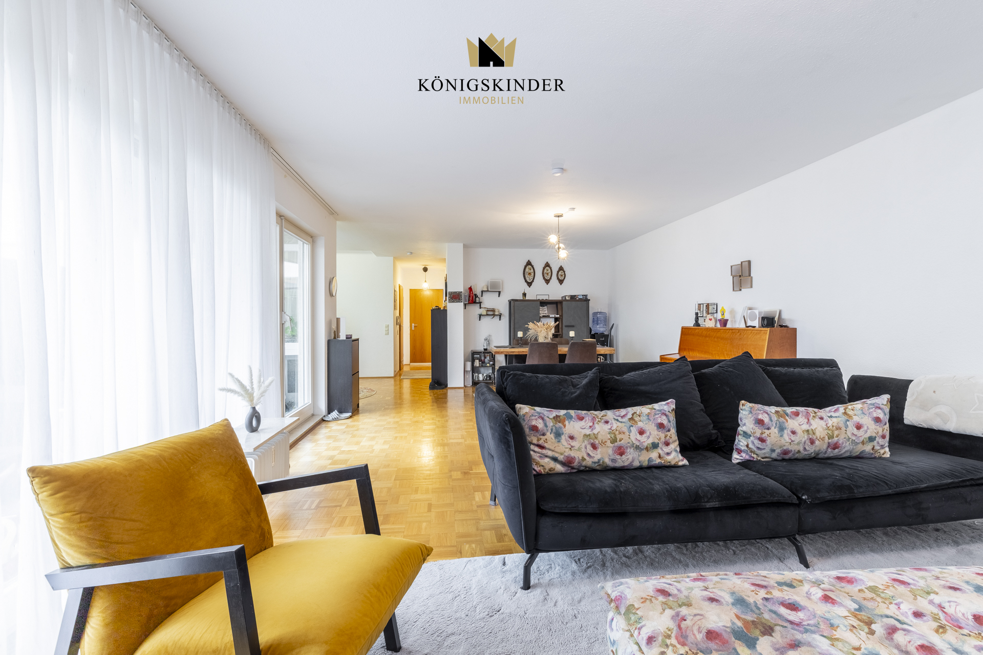 Herzstück der Wohnung – der Wohn- und Essbereich: Der helle Wohn- und Essbereich bildet das Zentrum der Wohnung. Große Fensterflächen lassen viel Tageslicht herein und schaffen ein offenes, freundliches Ambiente, während das Echtholzparkett für eine warme Wohnatmosphäre sorgt. Hier finden ein großzügiger Essplatz, eine gemütliche Sofalandschaft sowie ein flexibel nutzbarer Homeoffice-Bereich problemlos Platz. Direkt angrenzend öffnet sich die Terrasse – Innen- und Außenbereich gehen besonders in den warmen Monaten fließend ineinander über.