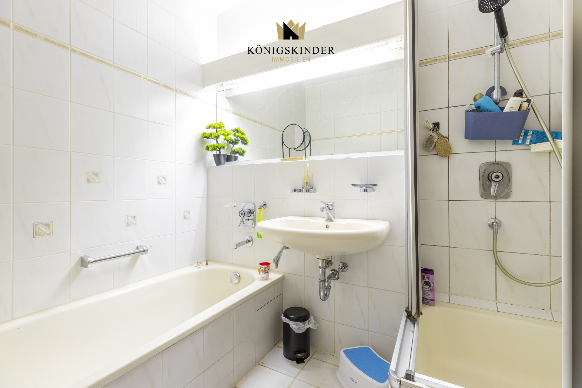 Badezimmer: Das Badezimmer überzeugt mit einer praktischen Kombination aus Badewanne und separater Dusche und bietet angenehme Bewegungsfreiheit im Alltag.