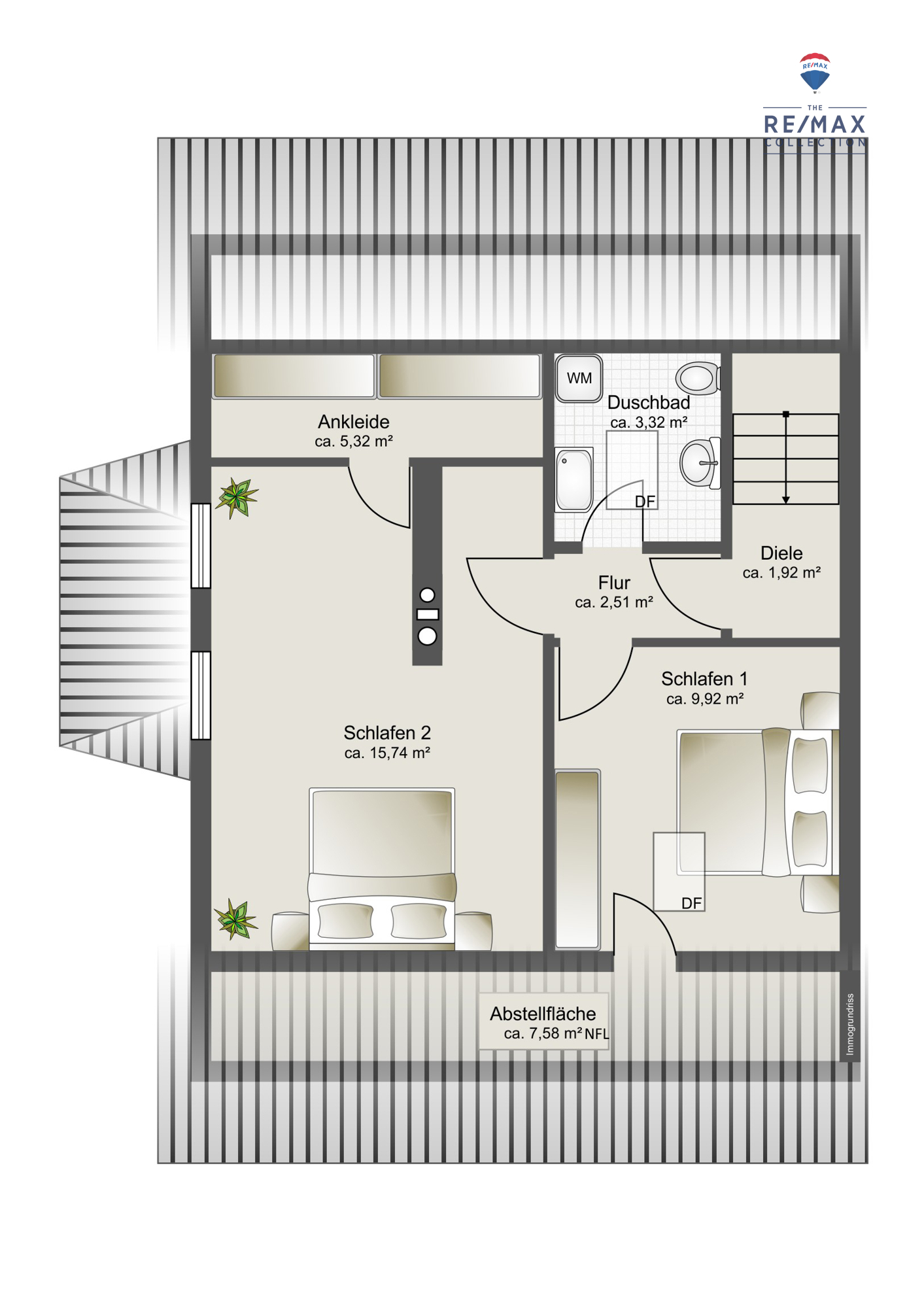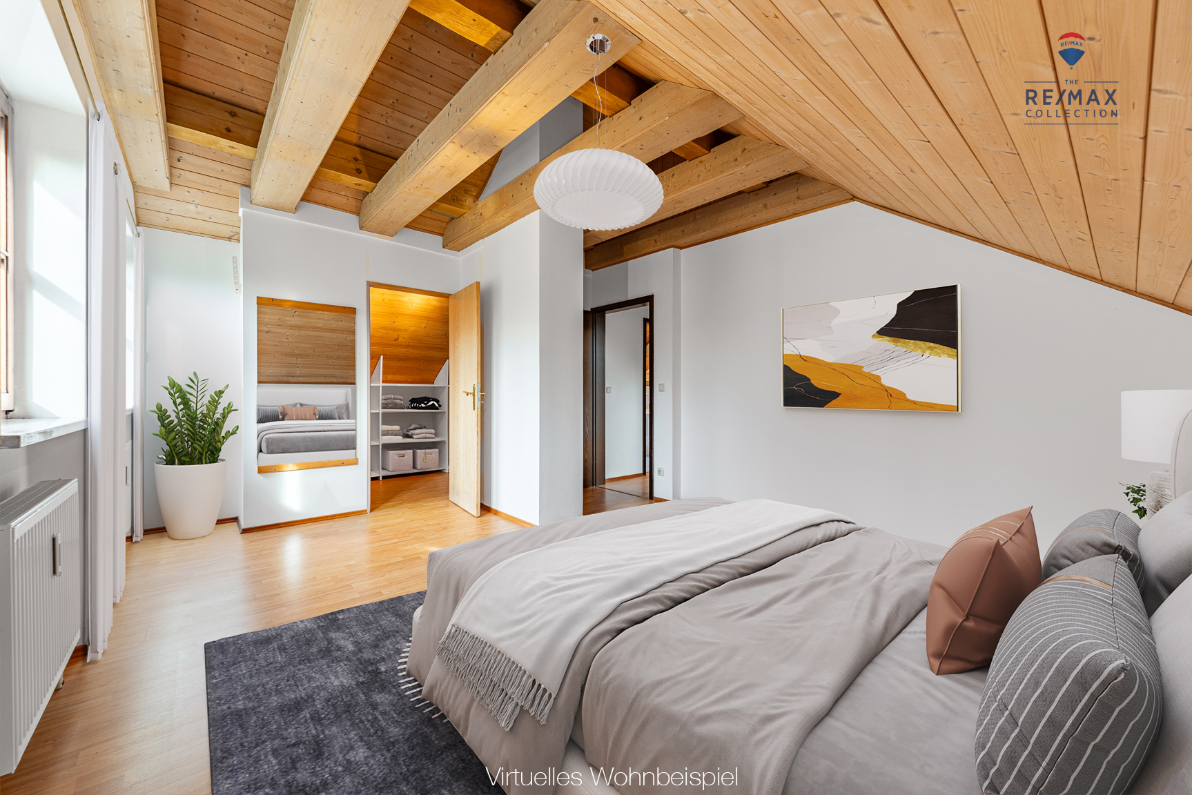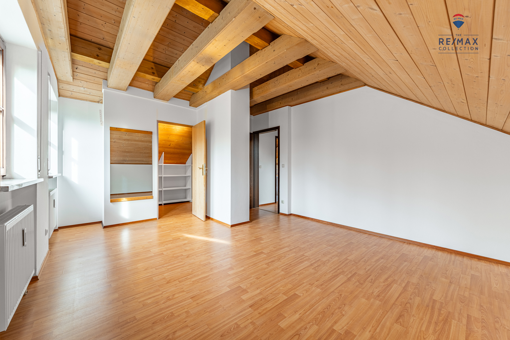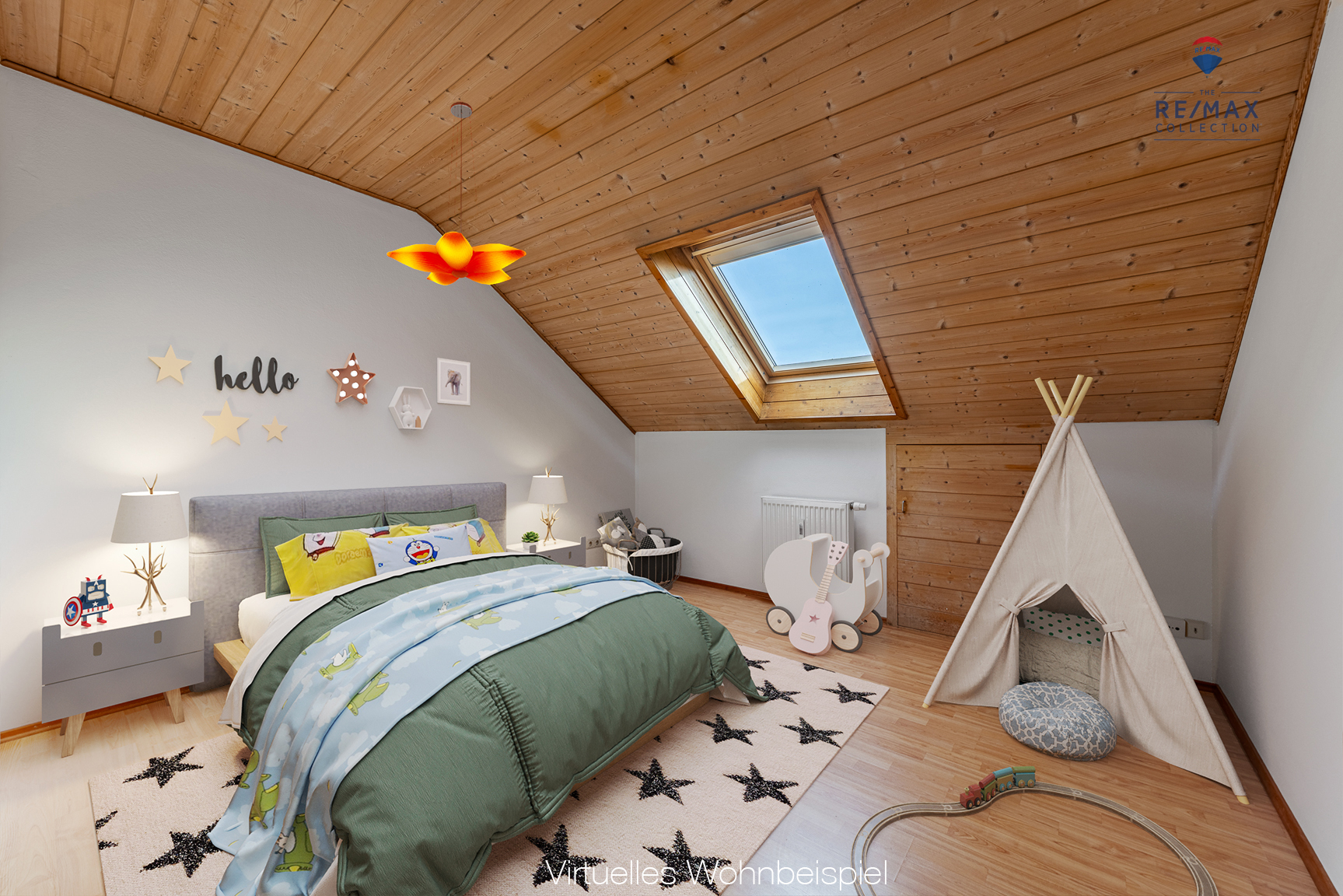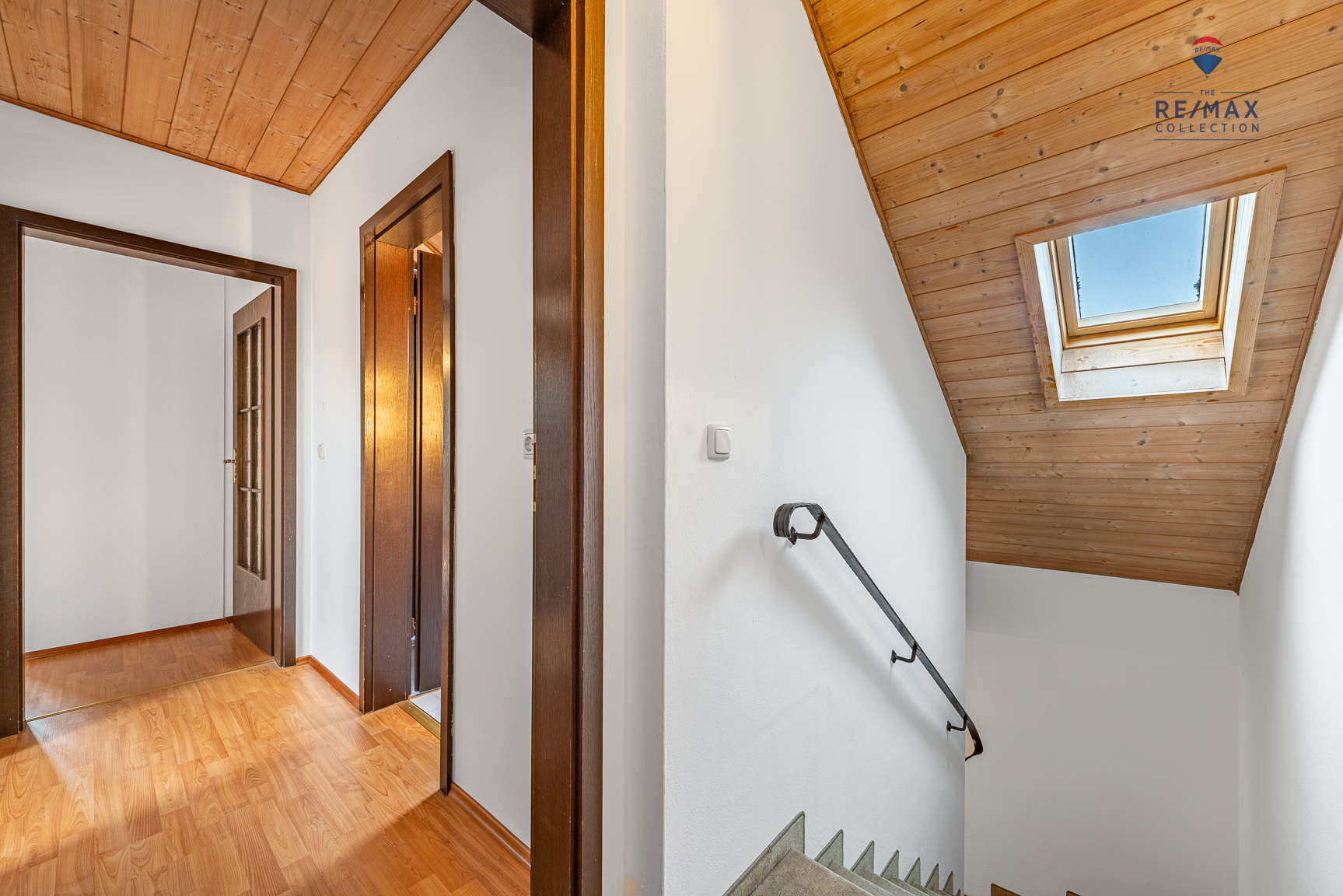 In der oberen Ebene (Dachgeschoss) ergänzen zwei Schlaf-/Kinderzimmer (eines davon mit Ankleideraum/begehbarer Kleiderschrank) sowie ein Tageslichtbad (Dachflächenfenster) mit Dusche, WC, Waschbecken und Waschmaschinenanschluss das großzügige Raumangebot.