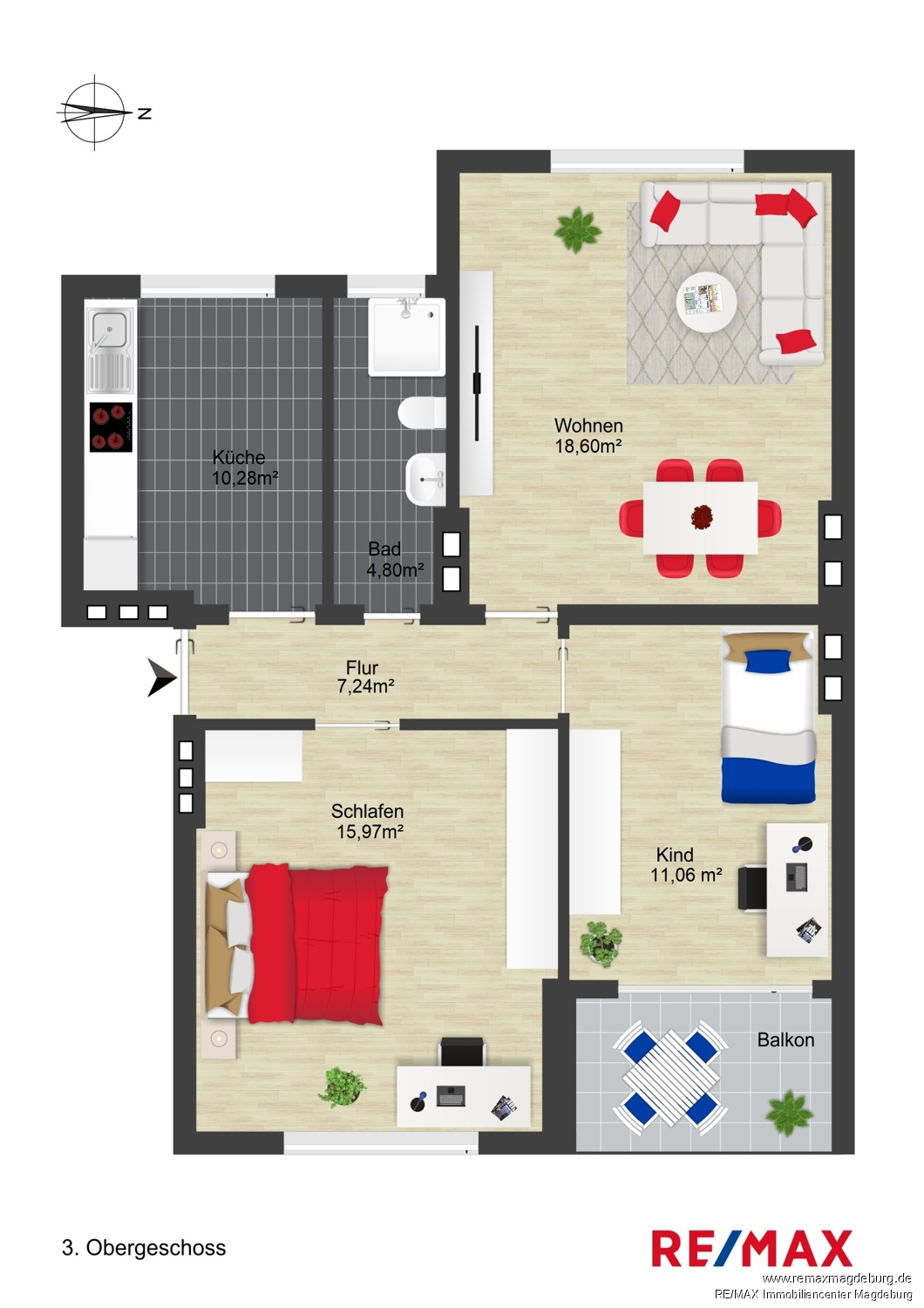 Die Eigentumswohnung im, 3. Obergeschoss gelegen, ist wie folgt aufgeteilt: - Flur, - Wohnzimmer, - Schlafzimmer, - Kinderzimmer, - Küche, - Badezimmer, - Balkon.