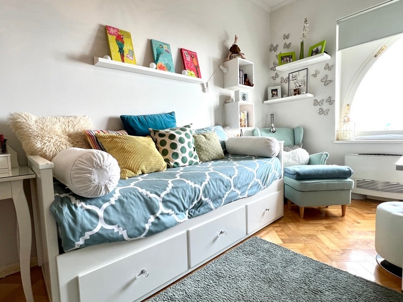 Die Wohnung ist nach Süden ausgerichtet. Im Außenbereich gehört ein privater Parkplatz zur Wohnung. Die Möblierung ist nicht im Kaufpreis inbegriffen.