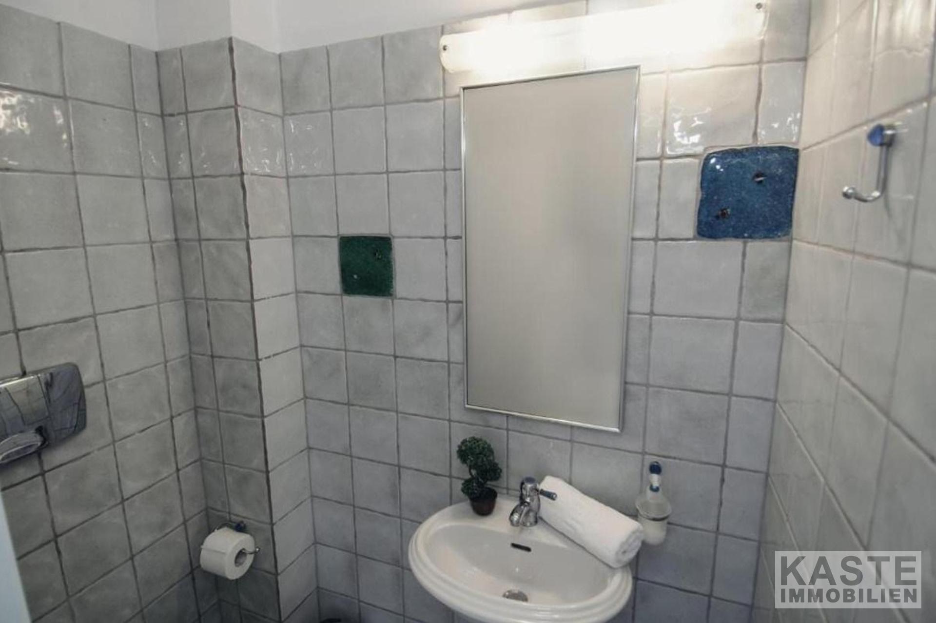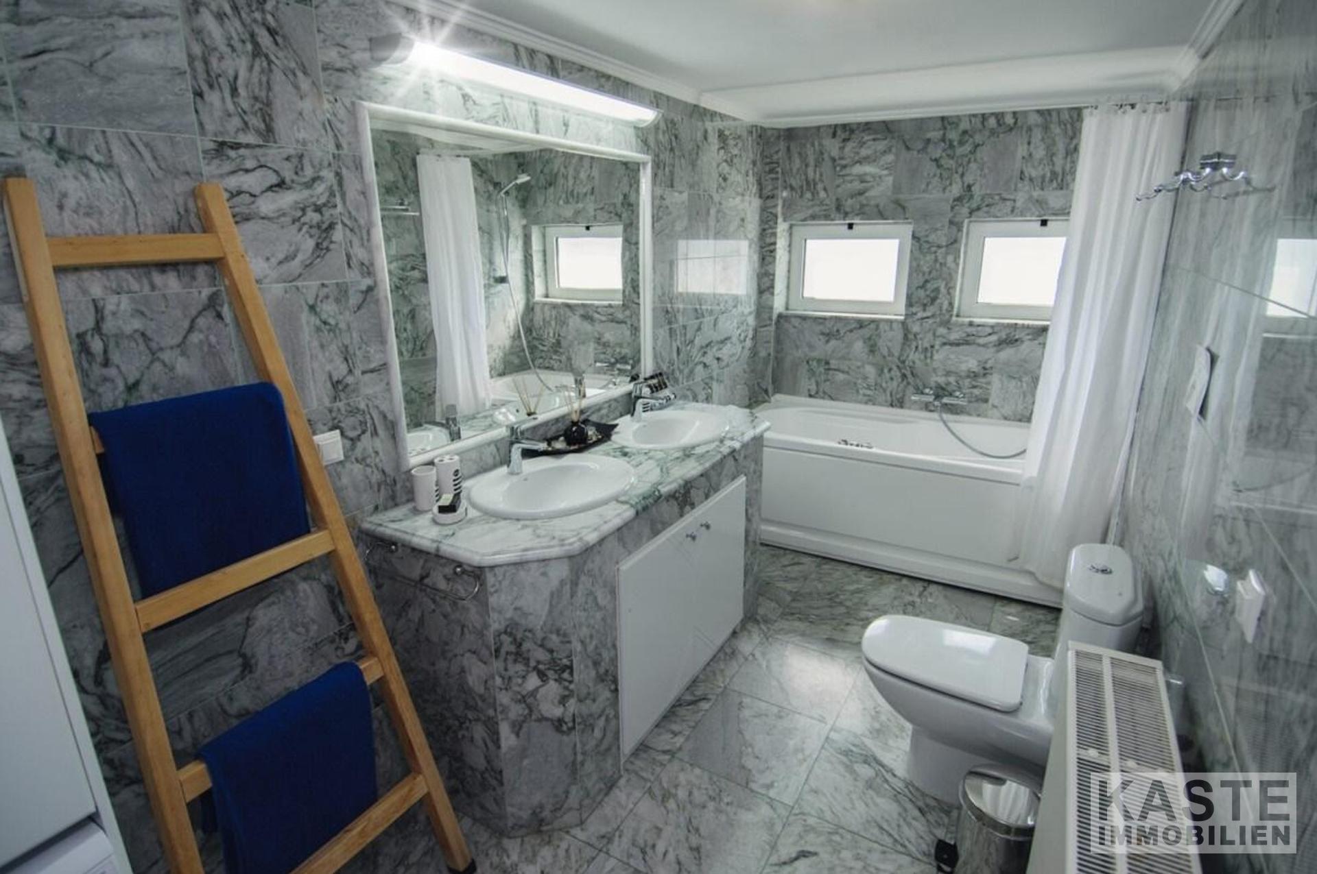Die Villa verfügt über eine Gästetoilette und einen kleinen Abstellraum im Flur, neben der Treppe, die zu einem zweiten Wohnzimmer mit einem Kamin und einem großen Fenster führt, das den Raum sehr hell macht. Über zwei Stufen gelangen Sie in das Badezimmer, das zwei Waschbecken unter dem großen Spiegel und eine Whirlpool-Badewanne enthält. Derzeit ist das Badezimmer mit einer Waschmaschine ausgestattet.
