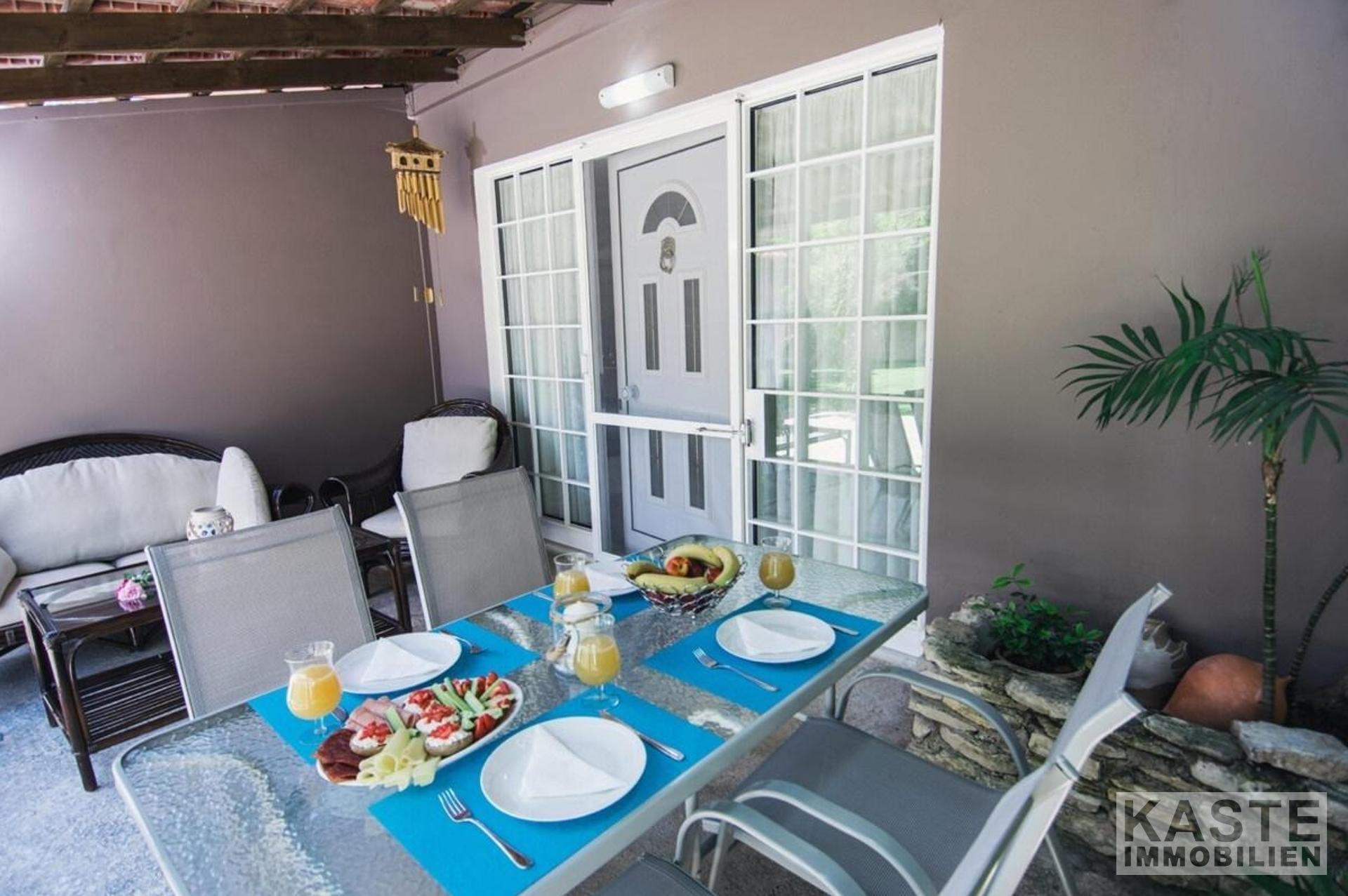 Über die Treppe am Eingang gelangen Sie in die Hauptvilla, die sich im ersten Stock befindet und drei Schlafzimmer und zwei Bäder mit Balkonen auf der Vorder- und Rückseite bietet. Durch den Haupteingang gelangen Sie in das Wohnzimmer und den Essbereich, der offen mit der Küche verbunden ist, die komplett ausgestattet ist und auch einen Geschirrspüler enthält. Die Küche verfügt außerdem über eine Frühstücksbar aus Glas und unbegrenzten Stauraum für Küchengeräte.