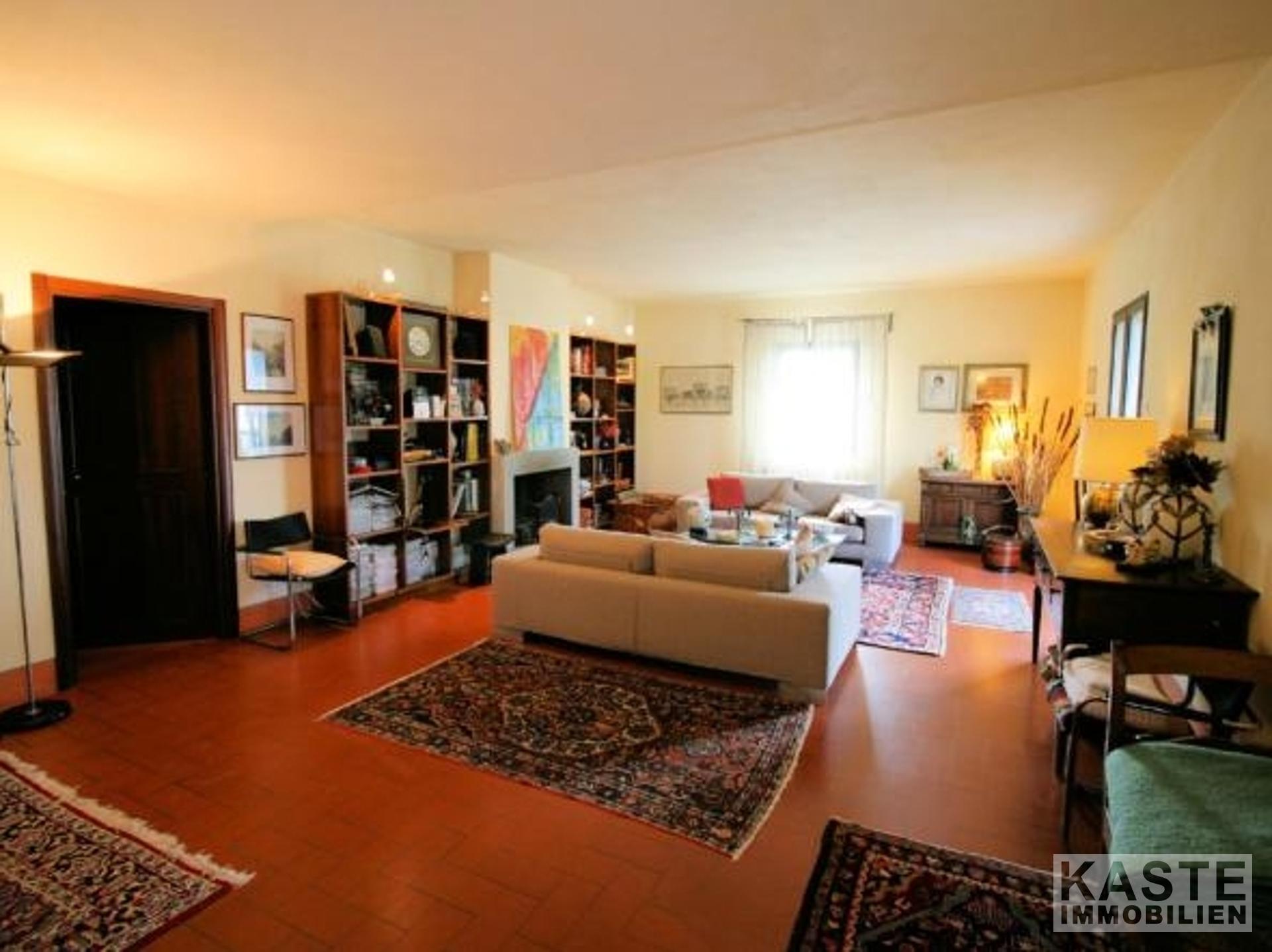 Die Innenräume sind lichtdurchflutet und einladend. Im Erdgeschoss erwartet Sie ein großzügiges Wohnzimmer mit mehreren Türen, die direkt in den Garten führen. Ergänzt wird dieser Bereich durch eine gemütliche Küche mit Kamin, ein separates Esszimmer, einen geräumigen Keller, einen Abstellraum sowie ein Badezimmer. Eine elegante Treppe aus „Serena“-Stein führt in das Obergeschoss, wo vier große Schlafzimmer – jeweils mit eigenem Bad – auf Sie warten. Typische toskanische Decken mit Holzbalken sowie edle Parkettböden verleihen den Räumen eine warme, elegante Atmosphäre.