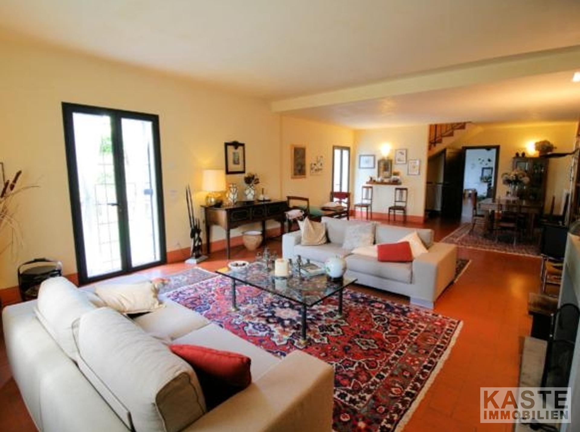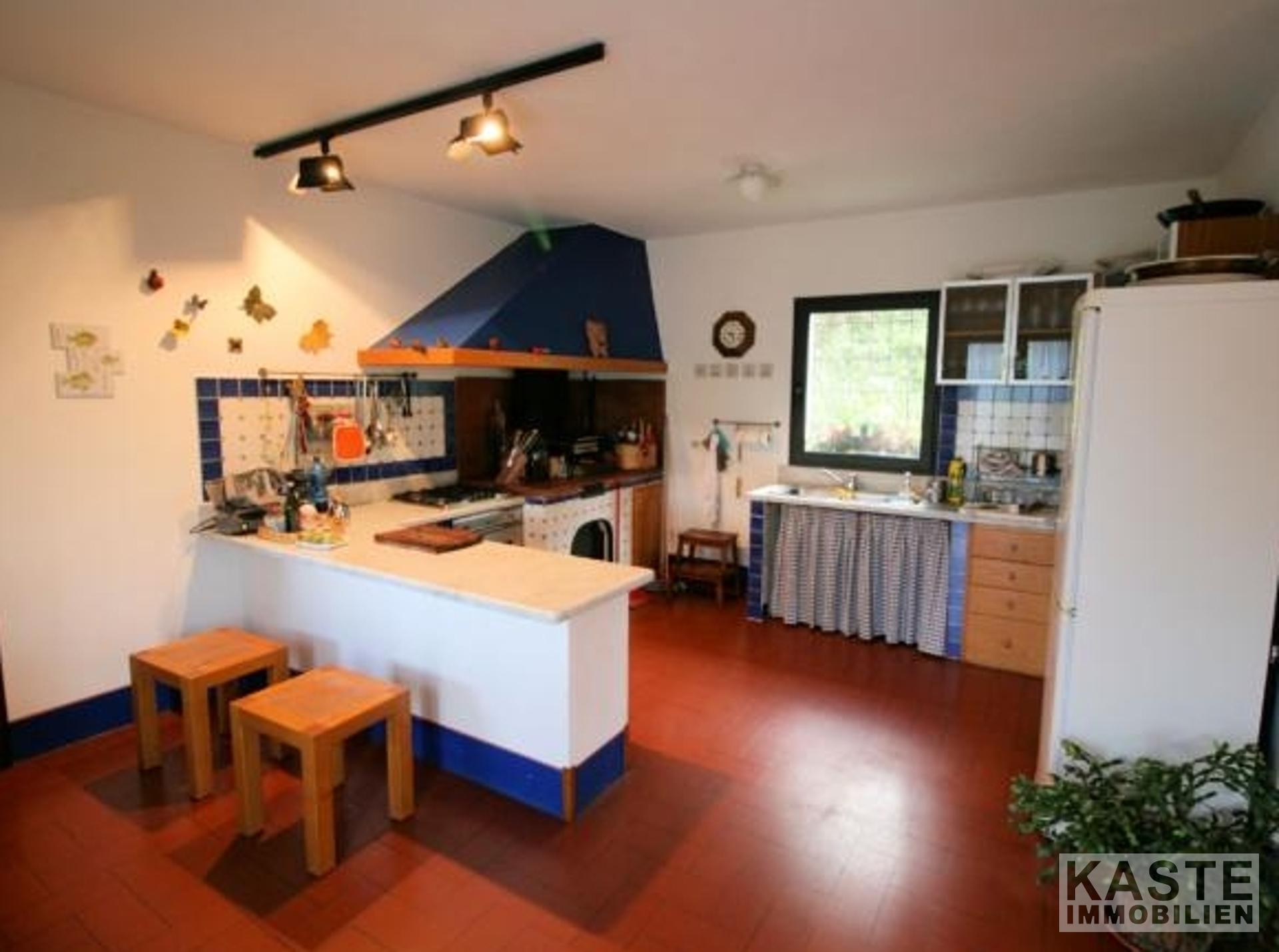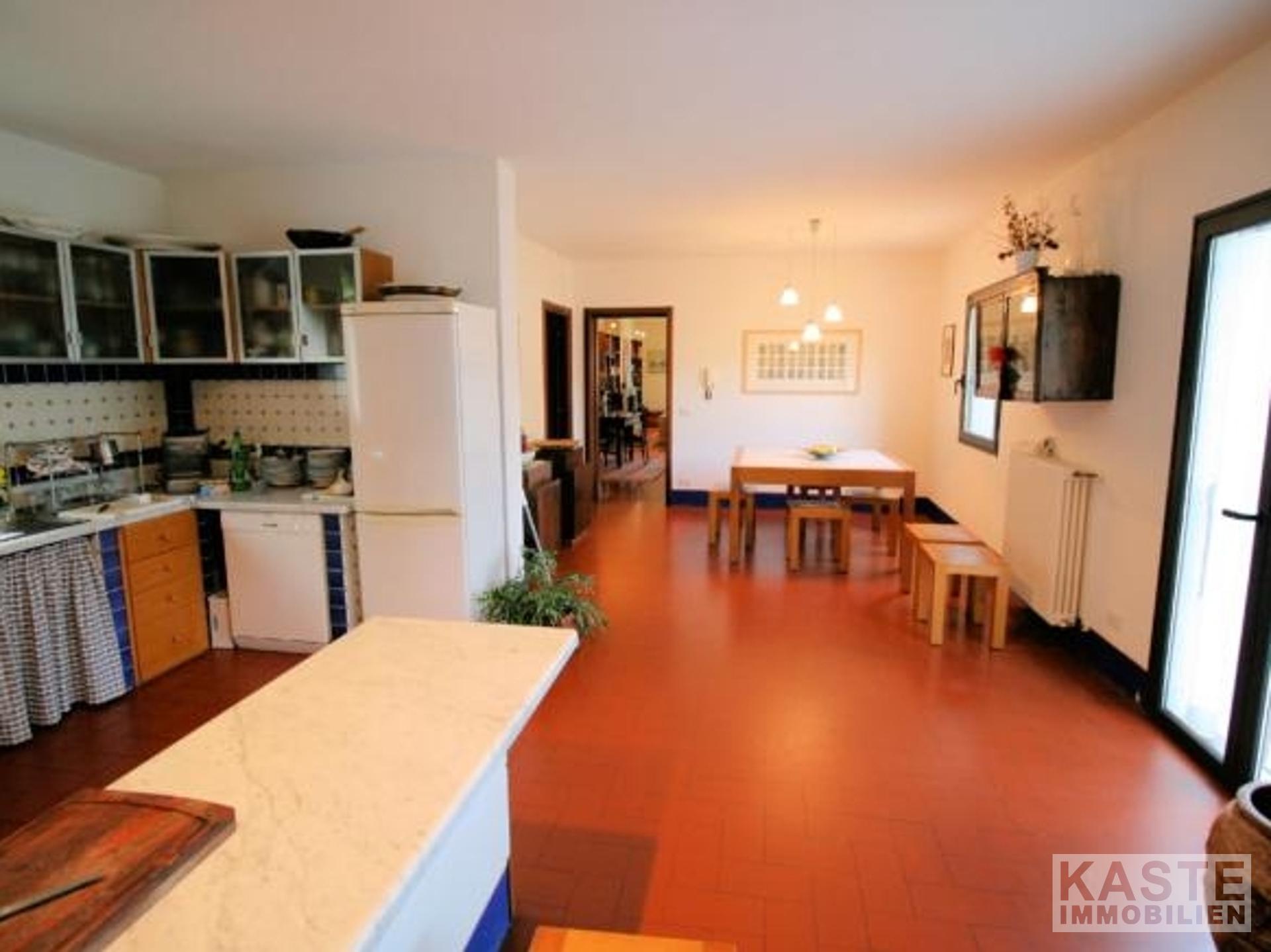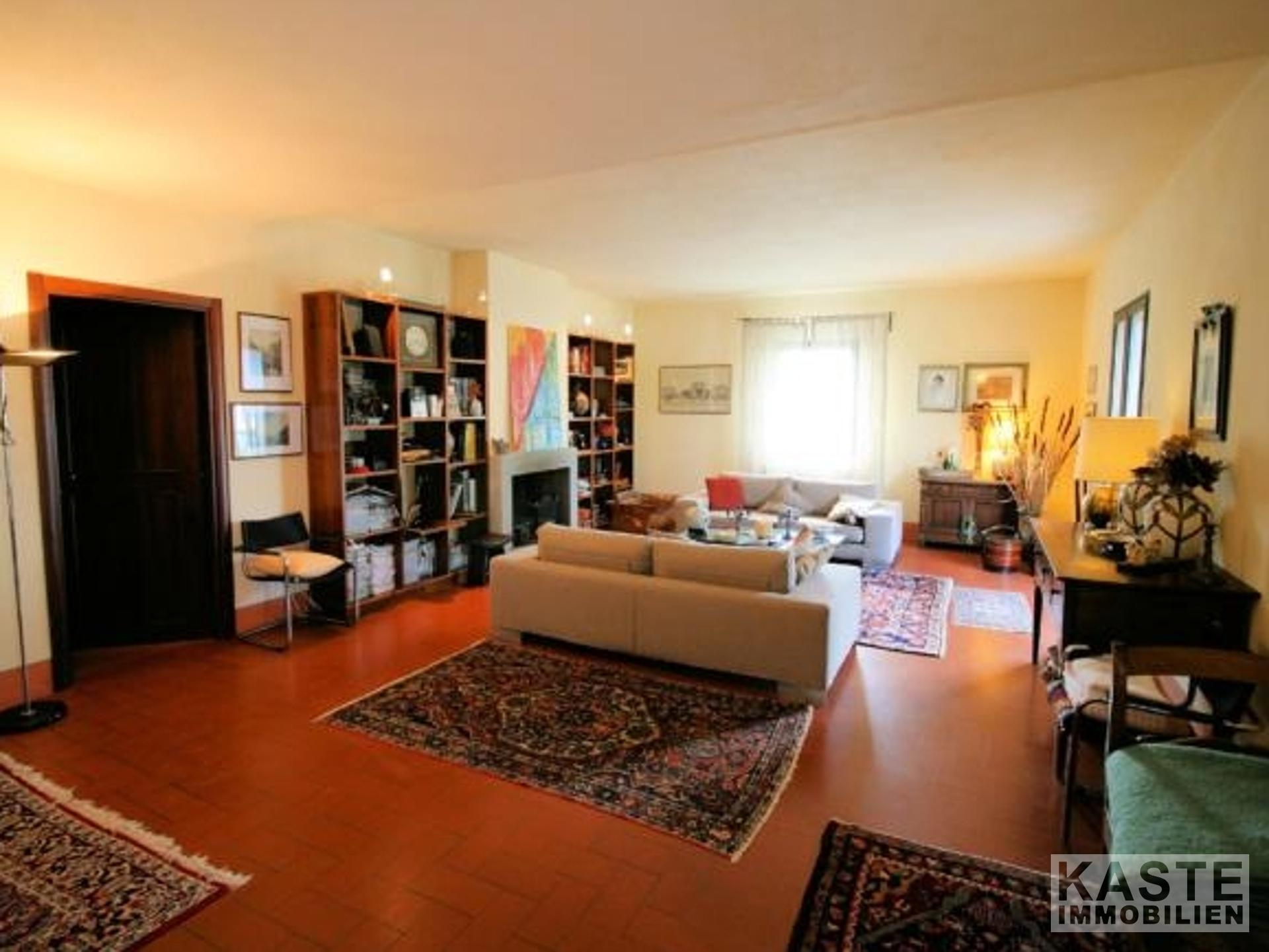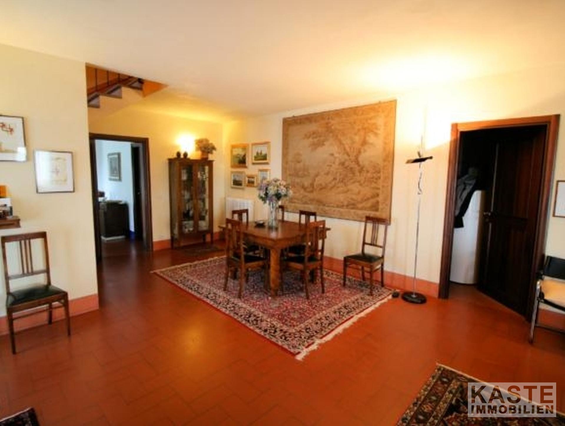 Die Innenräume sind lichtdurchflutet und einladend. Im Erdgeschoss erwartet Sie ein großzügiges Wohnzimmer mit mehreren Türen, die direkt in den Garten führen. Ergänzt wird dieser Bereich durch eine gemütliche Küche mit Kamin, ein separates Esszimmer, einen geräumigen Keller, einen Abstellraum sowie ein Badezimmer. Eine elegante Treppe aus „Serena“-Stein führt in das Obergeschoss, wo vier große Schlafzimmer – jeweils mit eigenem Bad – auf Sie warten. Typische toskanische Decken mit Holzbalken sowie edle Parkettböden verleihen den Räumen eine warme, elegante Atmosphäre.