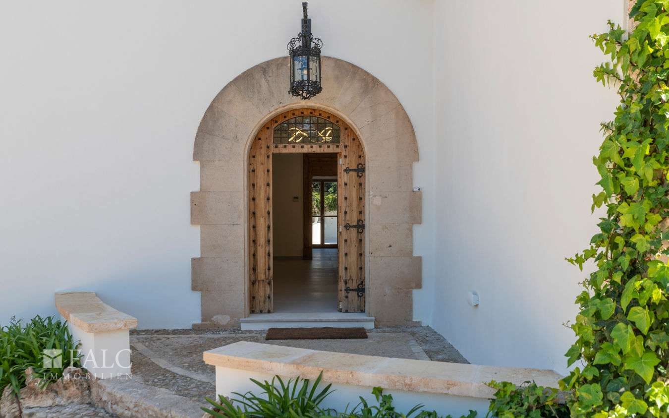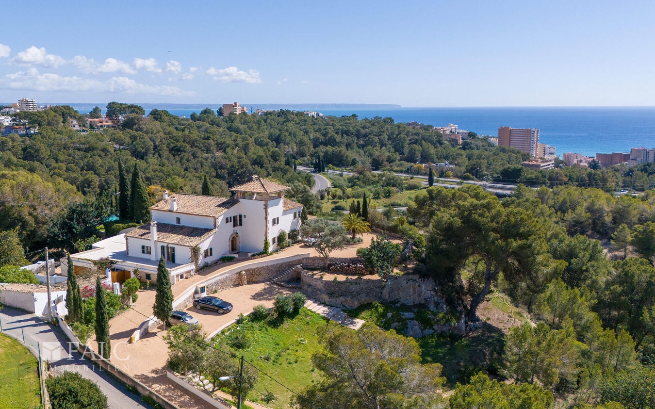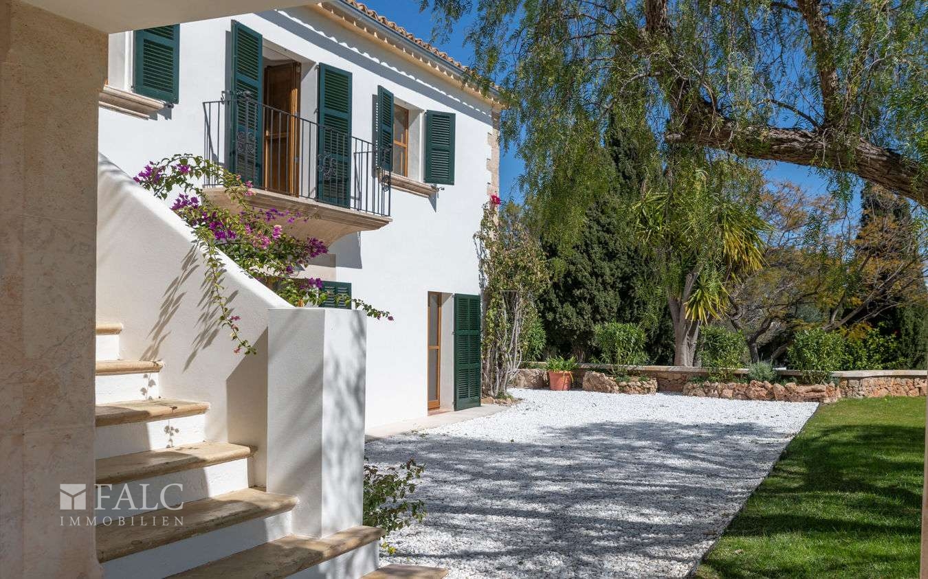 Dieses fantastische Herrenhaus in Genova wurde ursprünglich im Jahre 1900 für König Alonso XIII gebaut. Umgeben von ausgedehnten Grünflächen, Gärten und Terrassen bietet sich hier die exklusive Gelegenheit, ein aussergewöhnliches und vollständig renoviertes Anwesen in einer Wohngegend zu erwerben, von der aus man jeden Teil der Insel leicht erreichen kann. Die authentische Immobilie liegt auf einem ca. 10.000 m2 grossen Grundstück mit unendlichem Möglichkeiten und hoher Privatsphäre. Die ca. 629 m2 bebeaute Fläche verteilen sie ch auf 3 Etagen wie folgt: Das helle Erdgeschoss umfasst die Eingangshalle, mit Zugang zu den Wohnbereichen: das lichtdurchflutete Wohn-/Esszimmer, die Küche mit Frühstücksinsel, Weinkühlschrank und Leicht-Geräten, Gästetoiletten, Schlafzimmer mit eigenem Bad und Zugang zur gefliesten Terrasse, die auf den Garten mit Meerblick führt und sich hervorragend für gesellige Stunden im Freien eignet. Im Untergeschoss befindet sich der Keller mit Weinkeller, Speisekammer/Lagerraum, einem Gäste-/Personalzimmer mit eigenem Bad, dem Technikraum des Hauses und der Doppelgarage. Der 1. Stock besticht durch 3 weitere Schlafzimmer mit eigenem Bad und eine Master-Suite im 1. Hauptschlafzimmer mit schöner Holzbalkendecke und doppeltem Bad en-suite. Vom 1. Stock aus führt die Treppe zur fantastischen Turmterrasse mit einem 360-Grad-Blick auf das Anwesen und das Meer. Sie eignet sich perfekt für Nachmittagstee oder als Yoga-Plattform. Der Aussenbereich wird durch gepflegte Gartenbereiche, einen runden Swimmingpool, Garage und einen Steinofen ergänzt.