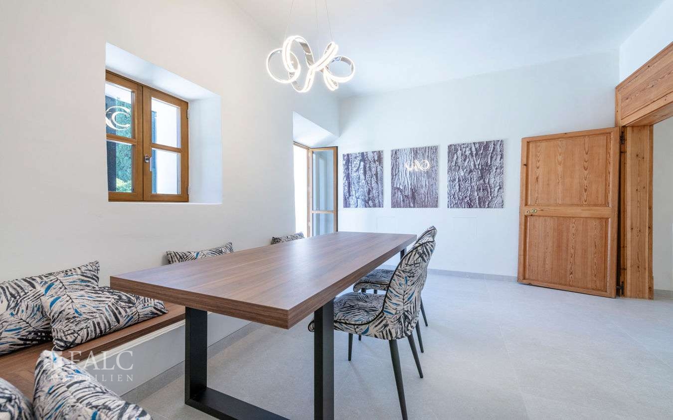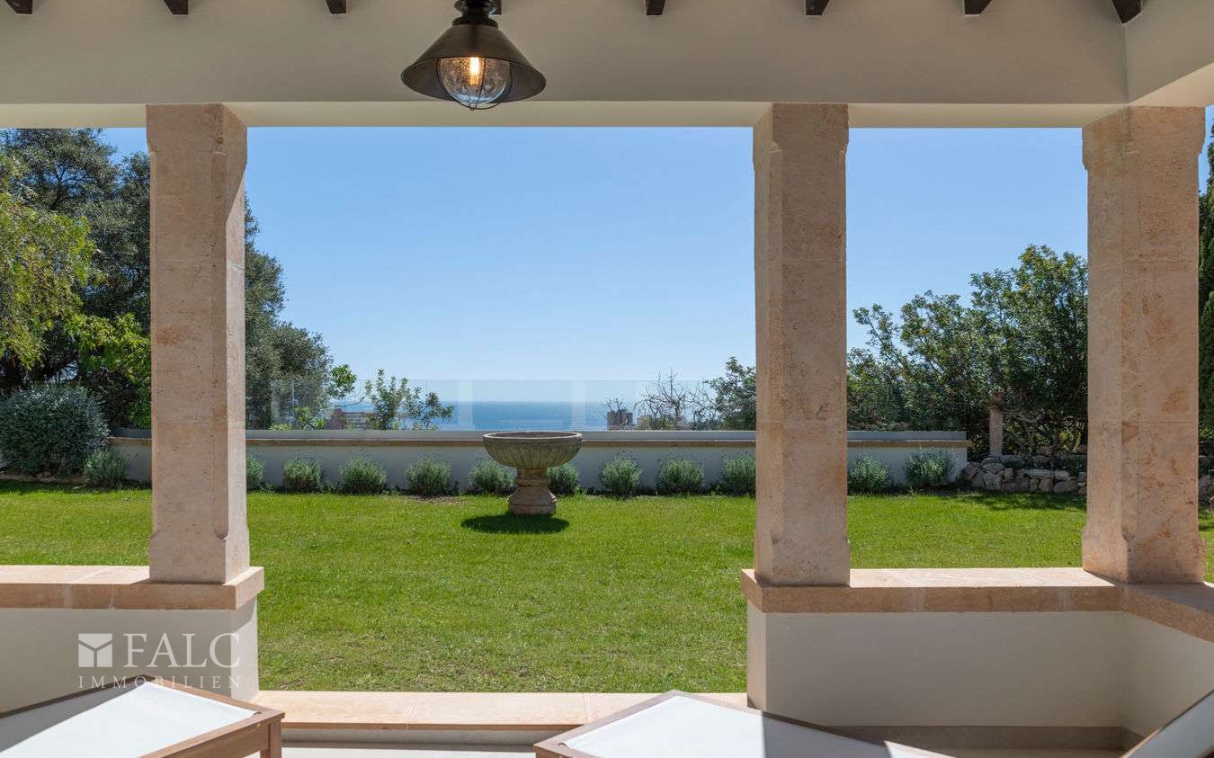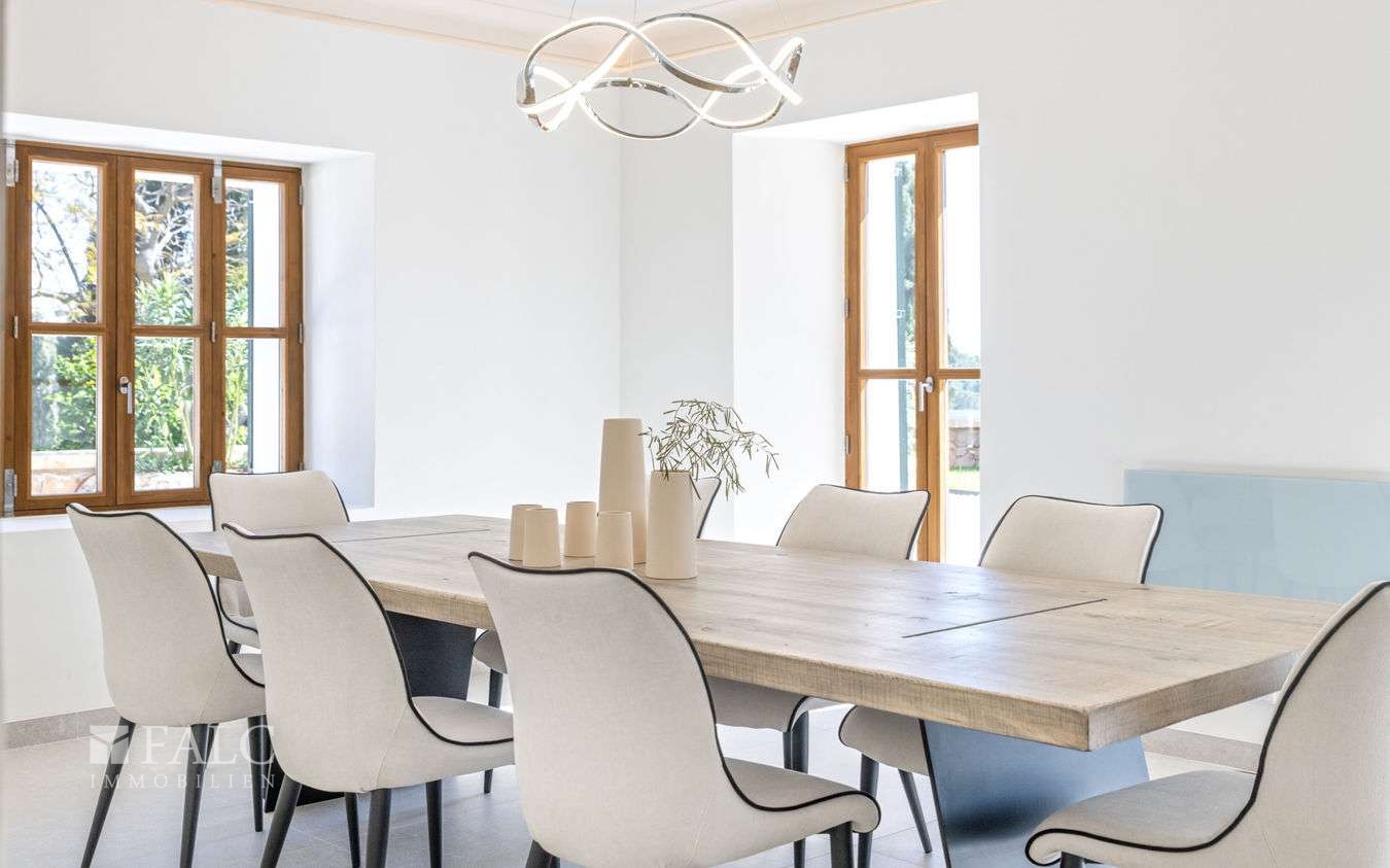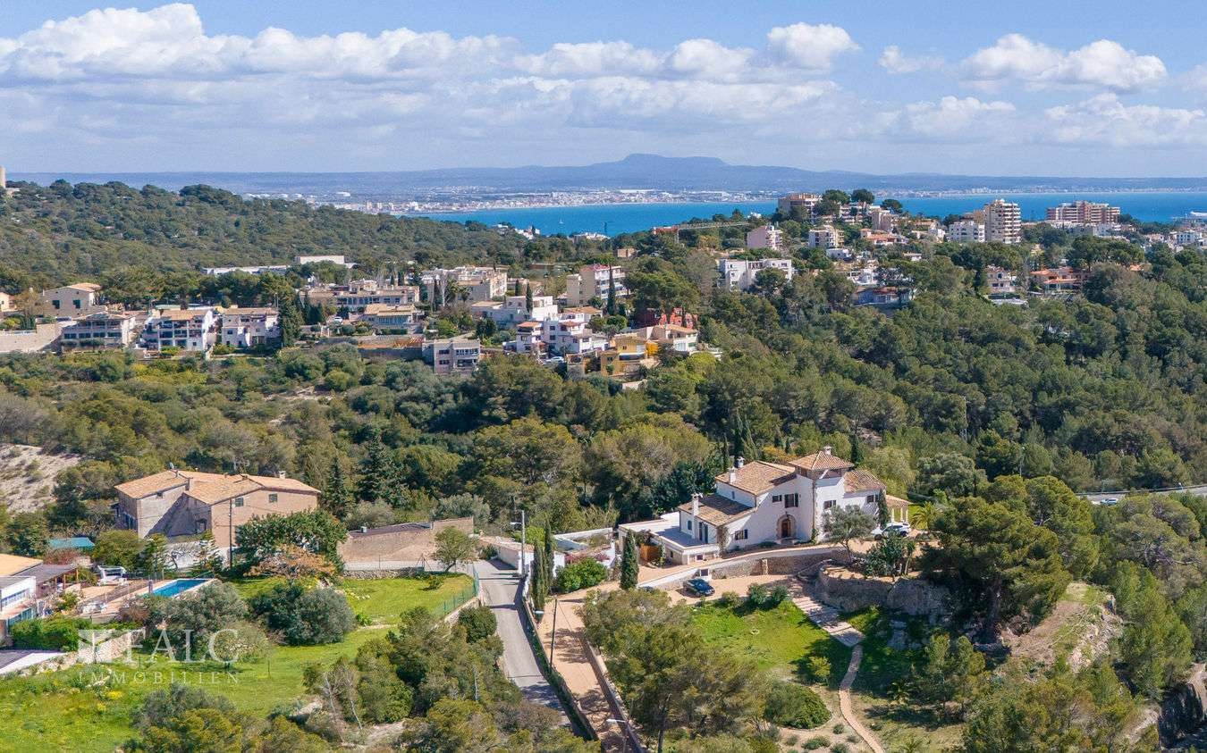 Dieses fantastische Herrenhaus in Genova wurde ursprünglich im Jahre 1900 für König Alonso XIII gebaut. Umgeben von ausgedehnten Grünflächen, Gärten und Terrassen bietet sich hier die exklusive Gelegenheit, ein aussergewöhnliches und vollständig renoviertes Anwesen in einer Wohngegend zu erwerben, von der aus man jeden Teil der Insel leicht erreichen kann. Die authentische Immobilie liegt auf einem ca. 10.000 m2 grossen Grundstück mit unendlichem Möglichkeiten und hoher Privatsphäre. Die ca. 629 m2 bebeaute Fläche verteilen sie ch auf 3 Etagen wie folgt: Das helle Erdgeschoss umfasst die Eingangshalle, mit Zugang zu den Wohnbereichen: das lichtdurchflutete Wohn-/Esszimmer, die Küche mit Frühstücksinsel, Weinkühlschrank und Leicht-Geräten, Gästetoiletten, Schlafzimmer mit eigenem Bad und Zugang zur gefliesten Terrasse, die auf den Garten mit Meerblick führt und sich hervorragend für gesellige Stunden im Freien eignet. Im Untergeschoss befindet sich der Keller mit Weinkeller, Speisekammer/Lagerraum, einem Gäste-/Personalzimmer mit eigenem Bad, dem Technikraum des Hauses und der Doppelgarage. Der 1. Stock besticht durch 3 weitere Schlafzimmer mit eigenem Bad und eine Master-Suite im 1. Hauptschlafzimmer mit schöner Holzbalkendecke und doppeltem Bad en-suite. Vom 1. Stock aus führt die Treppe zur fantastischen Turmterrasse mit einem 360-Grad-Blick auf das Anwesen und das Meer. Sie eignet sich perfekt für Nachmittagstee oder als Yoga-Plattform. Der Aussenbereich wird durch gepflegte Gartenbereiche, einen runden Swimmingpool, Garage und einen Steinofen ergänzt.