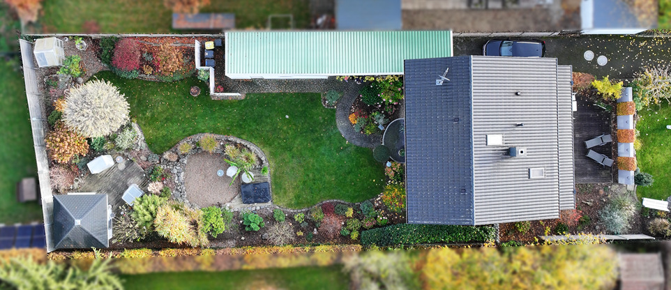 Der liebevoll gestaltete Garten bietet alles, was man sich für erholsame Stunden im Freien wünscht: viel Privatsphäre, genügend Rasenfläche zum Spielen und Platz zum Entspannen. Die große Terrasse lädt zu geselligen Momenten mit Familie und Freunden ein – dank ausfahrbarer Markise auch bei weniger gutem Wetter. Eine geräumige Gartenhütte sowie ein Gewächshaus erweitern das Nutzangebot. Abgerundet wird das Grundstück durch ein Carport und einen separaten Anbau für Gartengeräte.