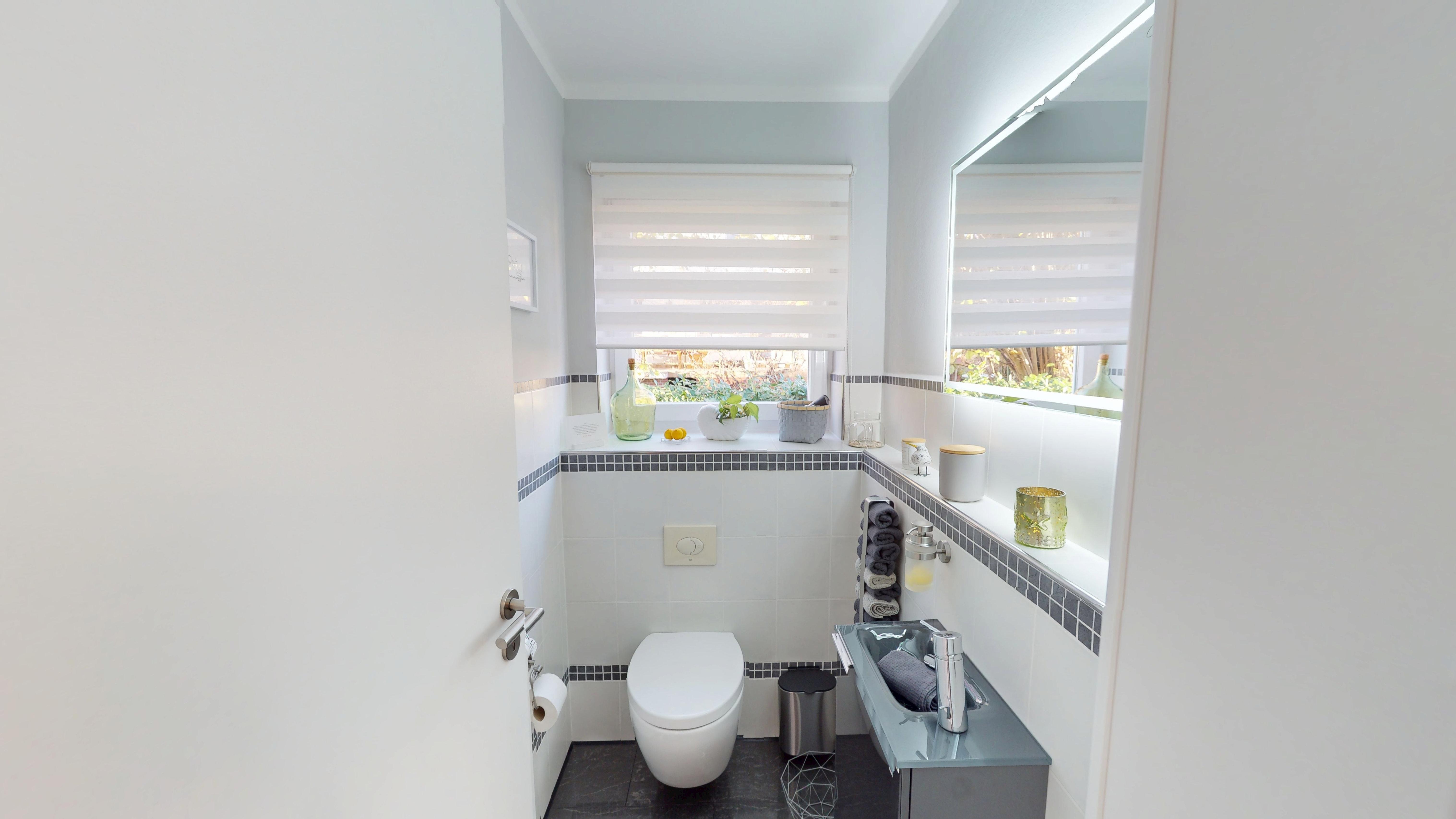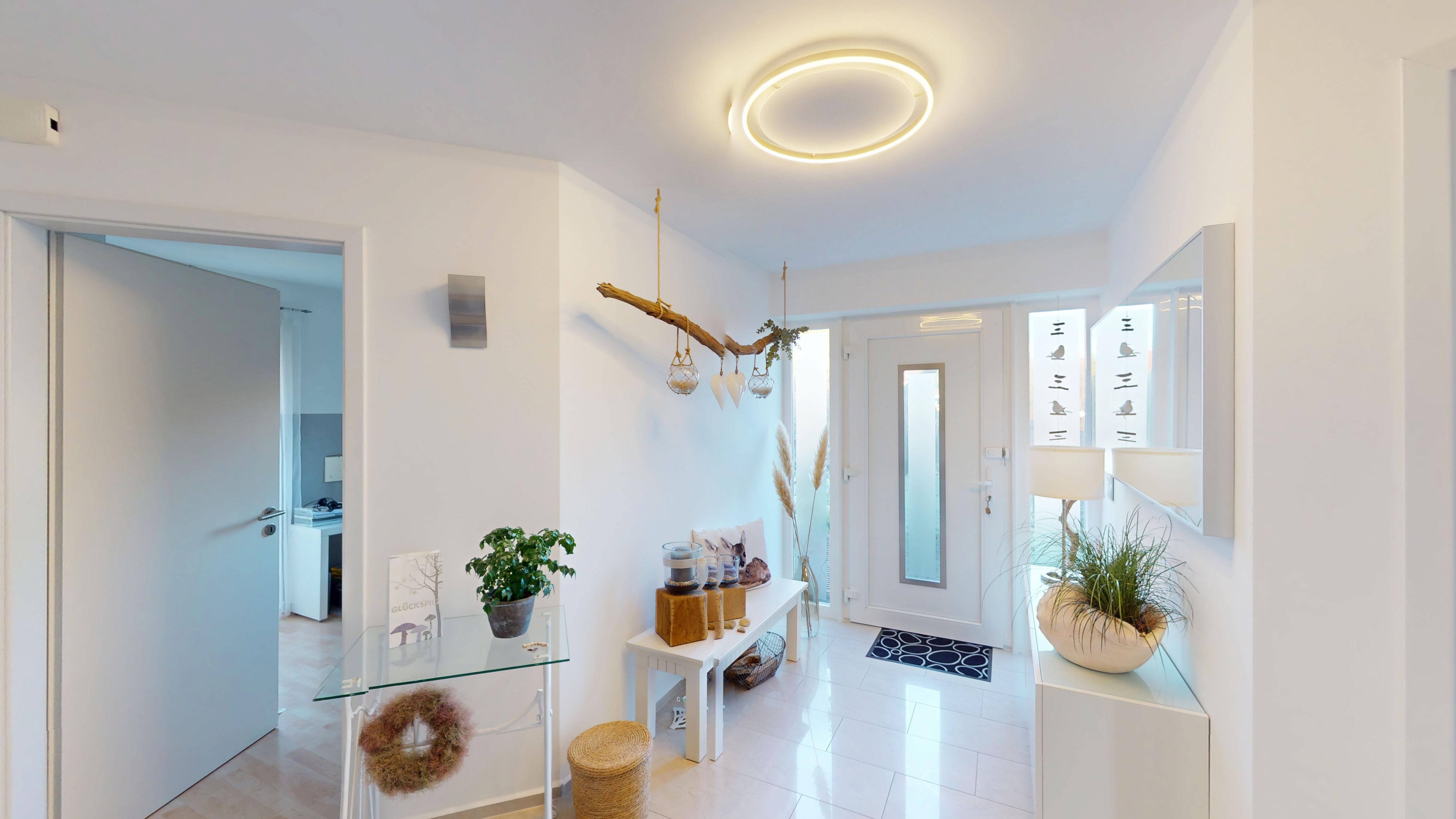 Das Haus besticht durch eine durchdachte und familienfreundliche Grundrissgestaltung, die sich besonders für Familien mit einem Kind eignet. Hochwertige Materialien, zahlreiche bodentiefe Fensterfronten und damit lichtdurchflutete Räume schaffen direkt beim Betreten eine warme und angenehme Wohnatmosphäre. Elektrische Jalousien, Fußbodenheizung in Wohnzimmer, Essbereich und Badezimmer, integrierte Decken-Spots, stilvolle Mosaik-Elemente im Bad sowie elegante Fensterdetails im Ochsenaugen-Stil setzen zusätzliche Akzente und unterstreichen den hochwertigen Charakter der Immobilie.