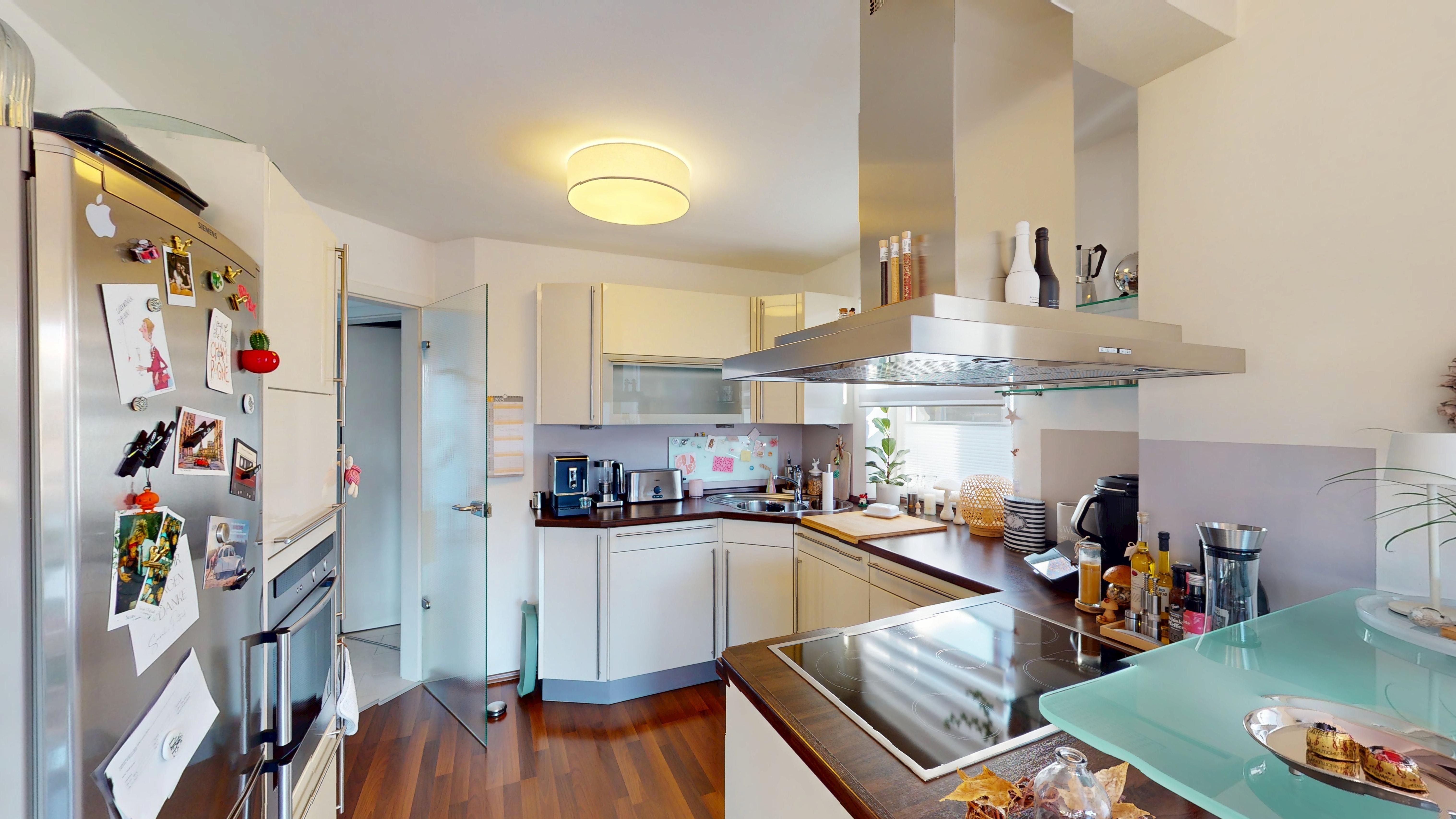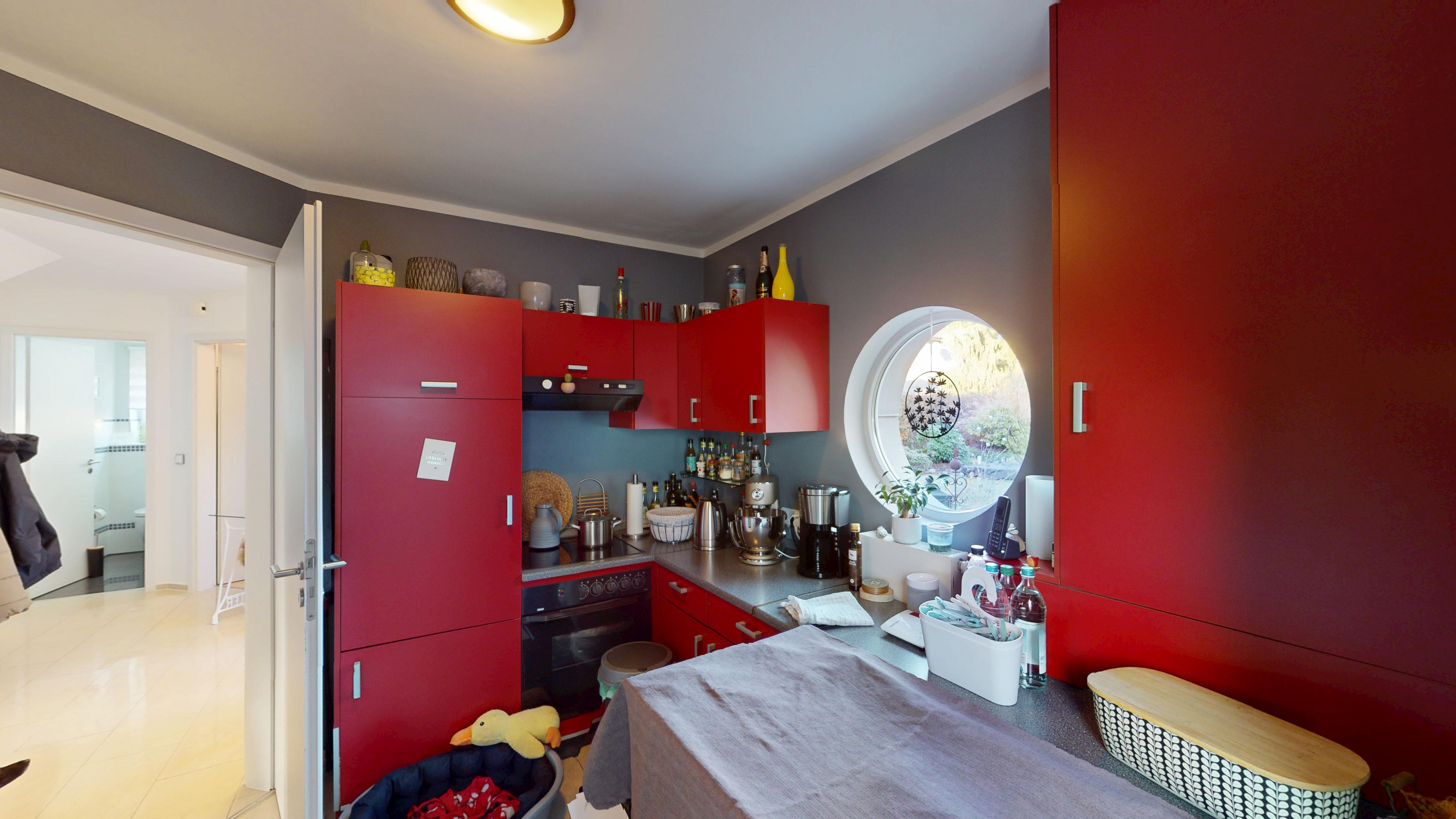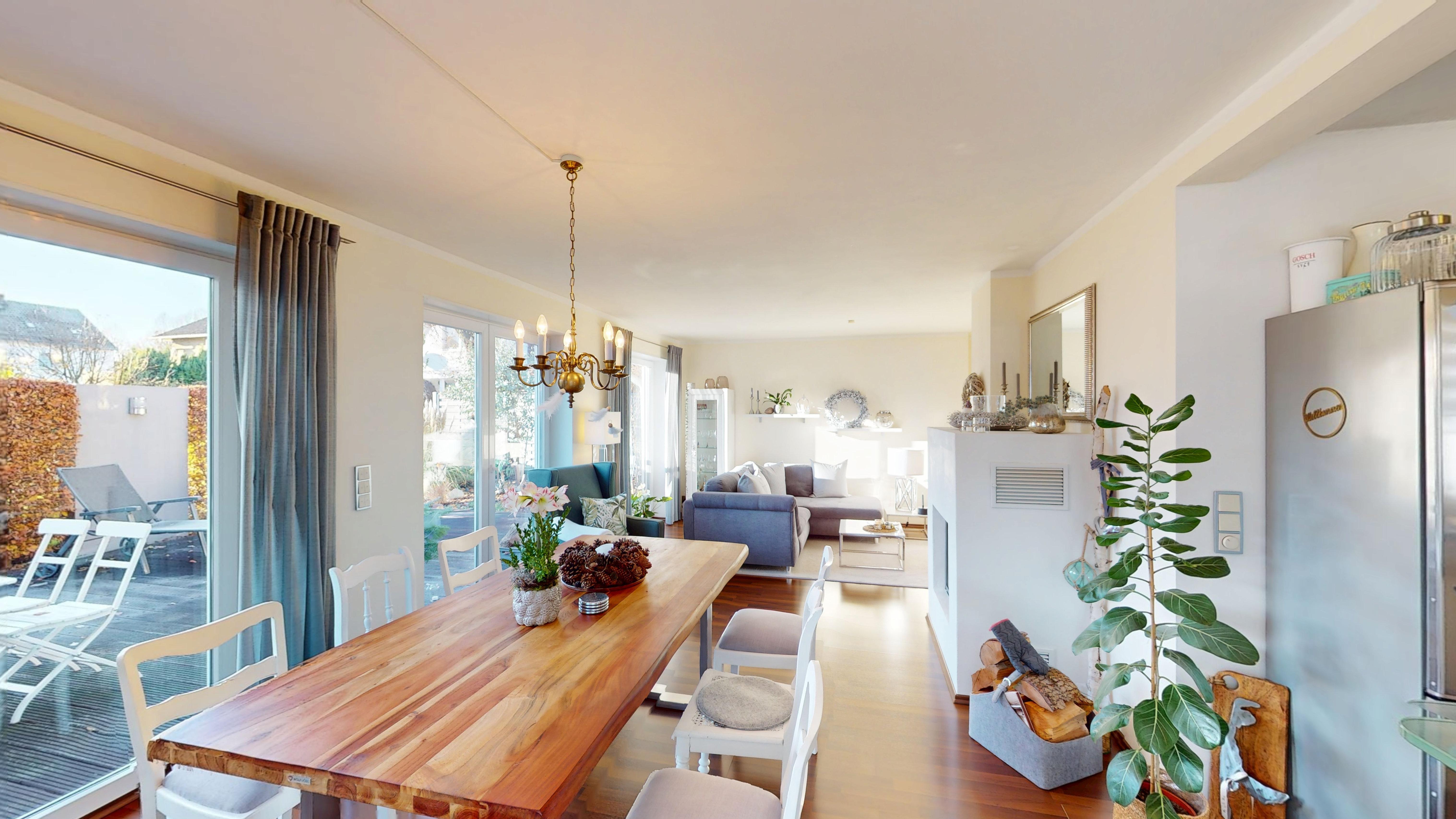 Der großzügige Eingangsbereich ermöglicht einen bequemen Zugang zu allen Räumen. Das helle Wohnzimmer mit Kamin öffnet sich zur großen Terrasse und ist offen mit dem Essbereich sowie der angrenzenden, modernen Einbauküche verbunden – ein idealer Platz für gemeinsames Familienleben. Ein weiterer Raum bietet flexible Nutzungsmöglichkeiten, etwa als Büro oder Gästezimmer. Ergänzt wird die Ebene durch ein Gäste-WC und einen Hauswirtschaftsraum, der zusätzlich mit einer zweiten Küche ausgestattet ist.