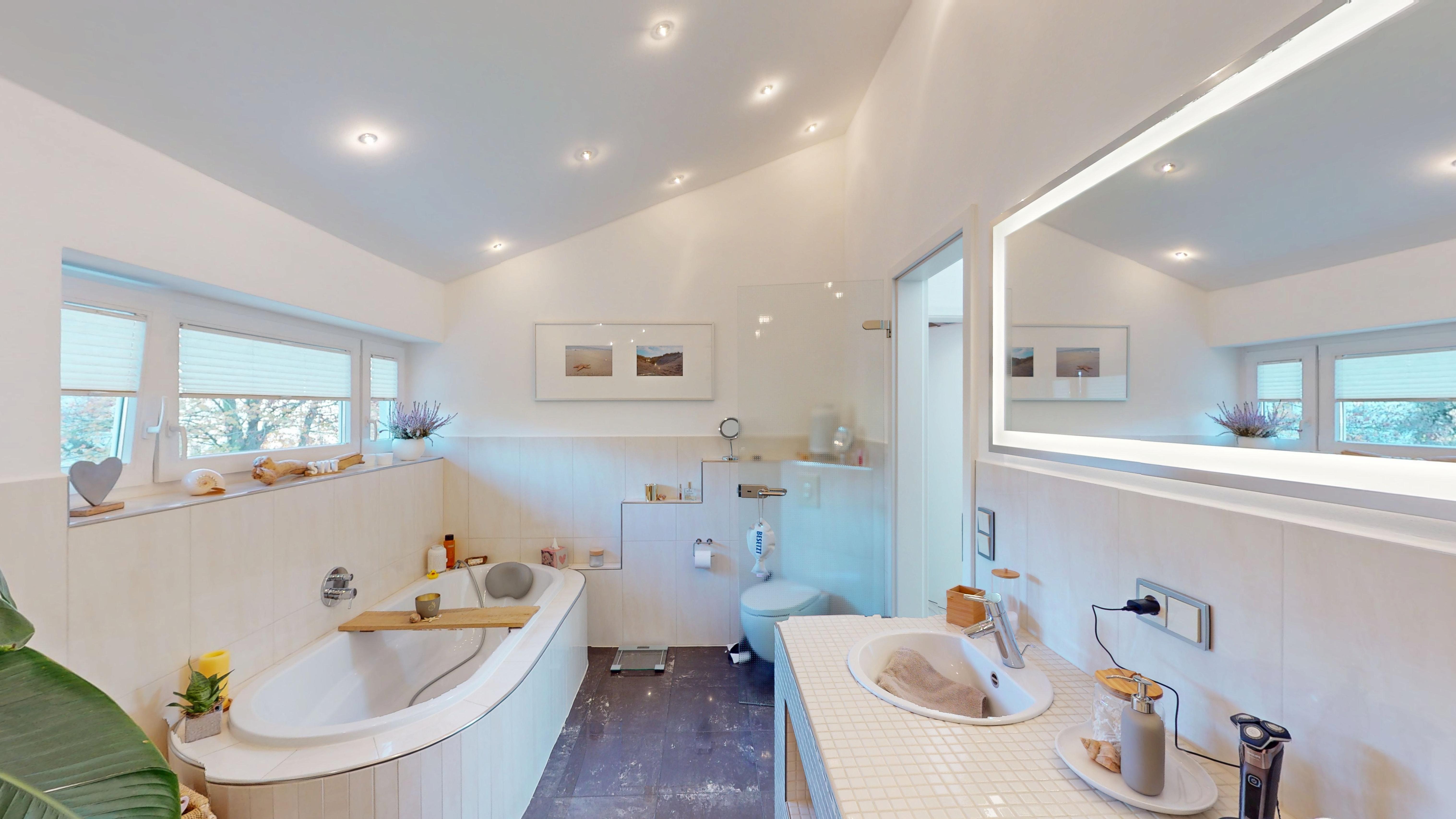 Auch das Obergeschoss vermittelt von der ersten Sekunde an ein sehr einladendes Wohngefühl. Freuen Sie sich auf ein modernes, großzügiges Badezimmer mit Doppelwaschbecken, Badewanne und begehbarer Dusche sowie zwei sehr gut geschnittene Schlafzimmer. Ein angrenzender Abstellraum bietet praktischen Stauraum und beherbergt zudem die im Jahr 2018 erneuerte Gasheizung.