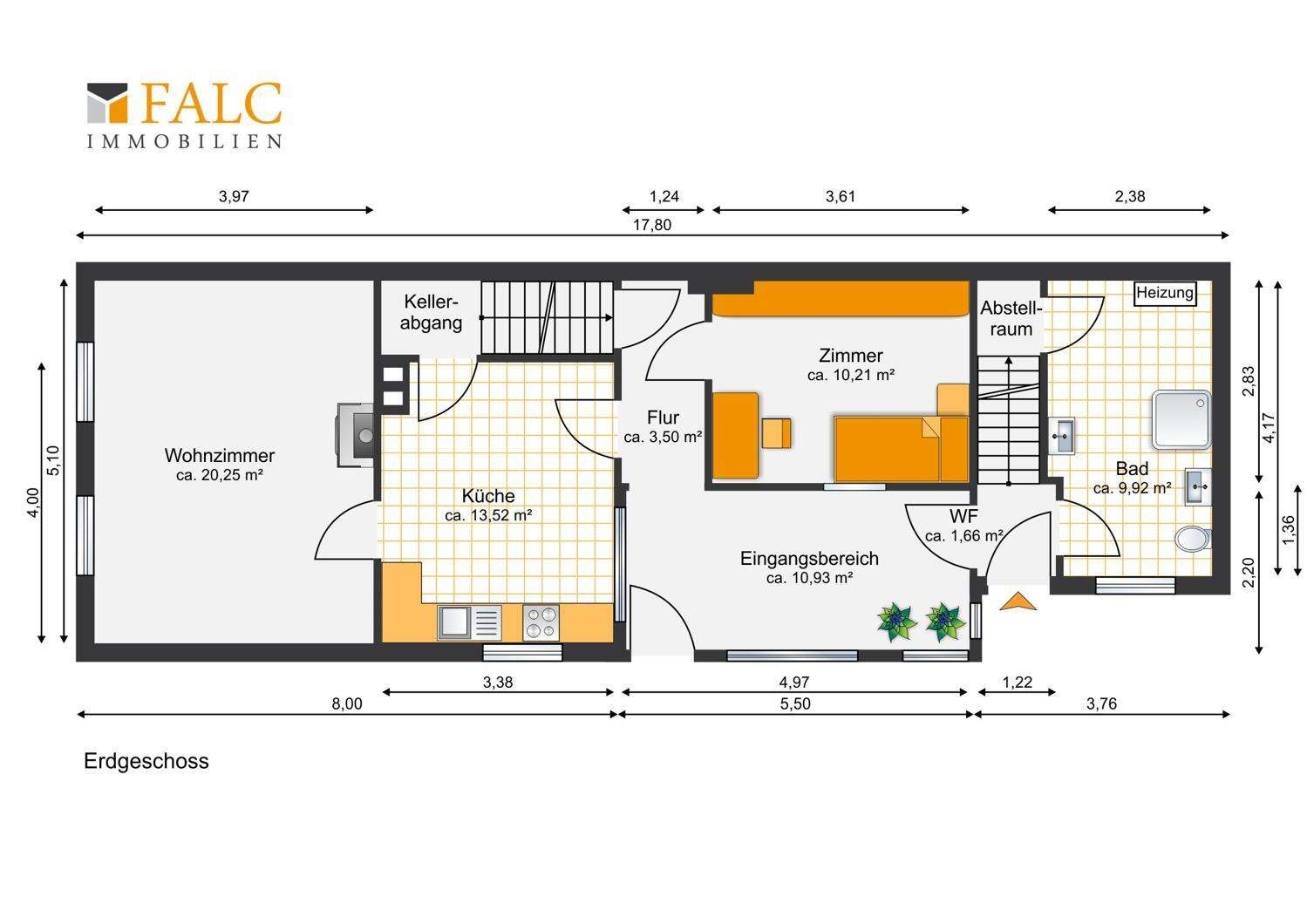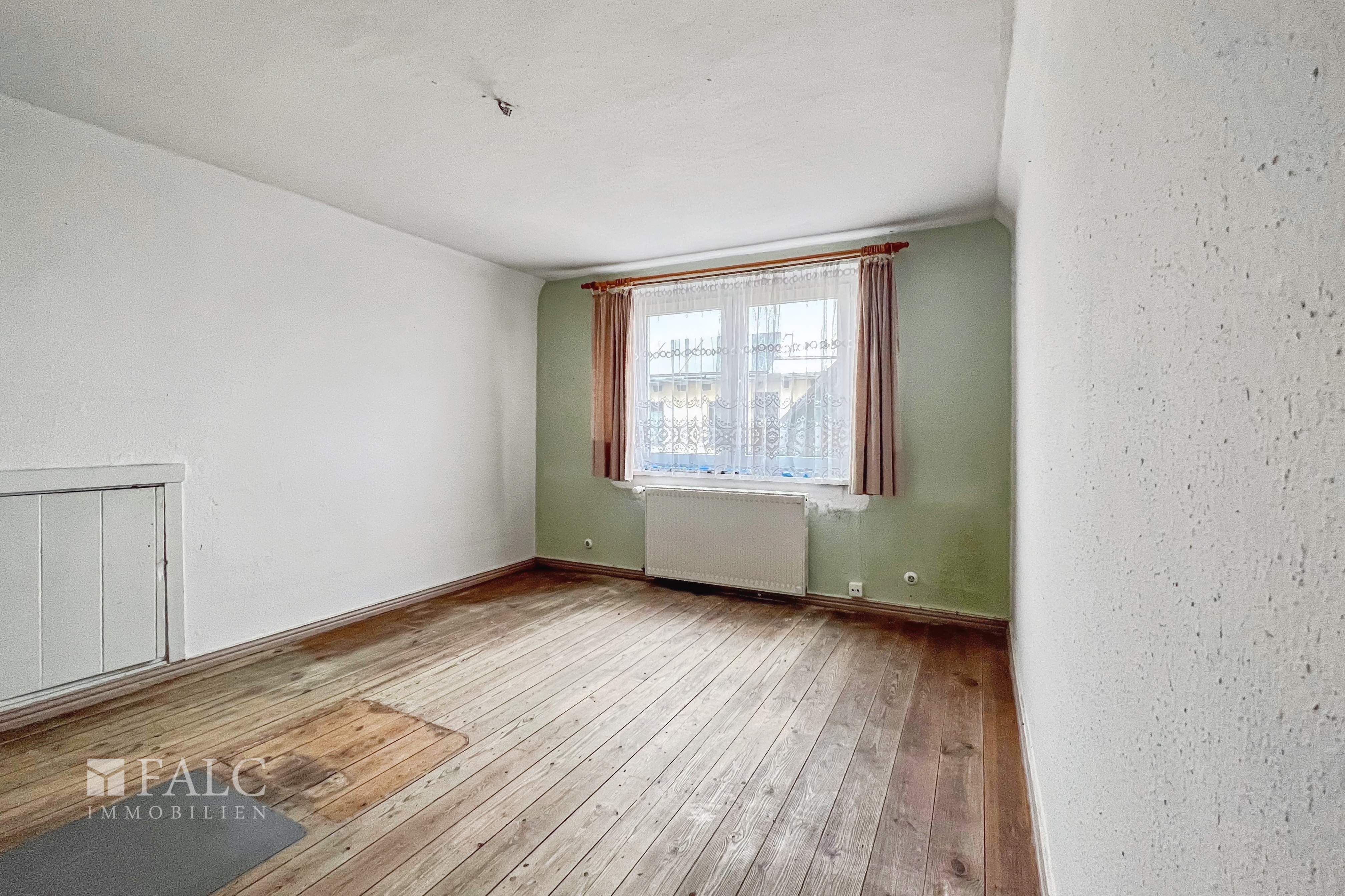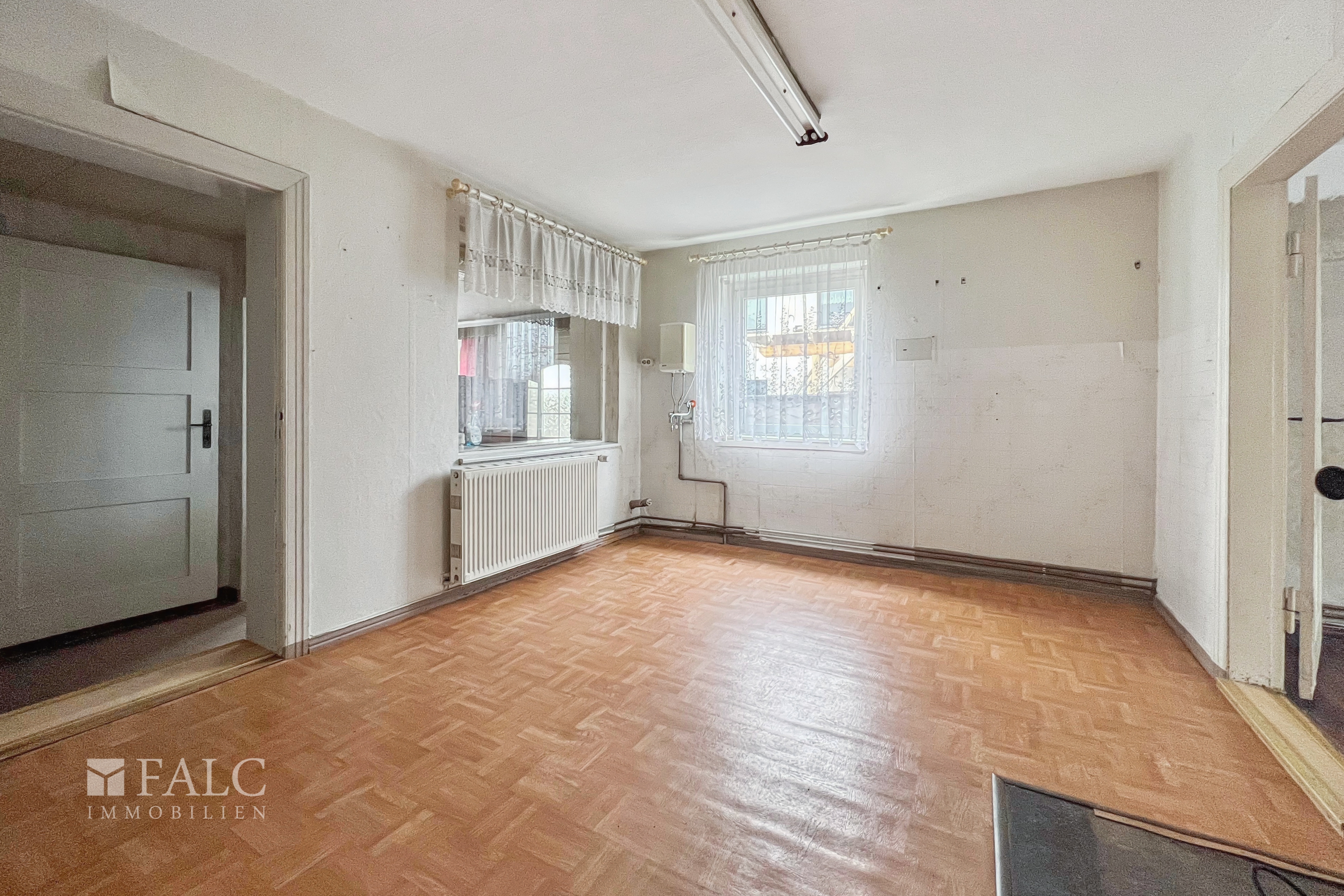 Im Erdgeschoss des Hauses befindet sich das Wohnzimmer, eine große Küche, ein Zimmer, der Flur sowie das Bad des Hauses. Das Obergeschoss ist aktuell in zwei Bereiche aufgeteilt. Hier befinden sich drei weitere Zimmer. Die Immobilie ist teilunterkellert im Bereich der Küche, mit einem Luftschutzkeller welcher als Versorgungskeller dient.