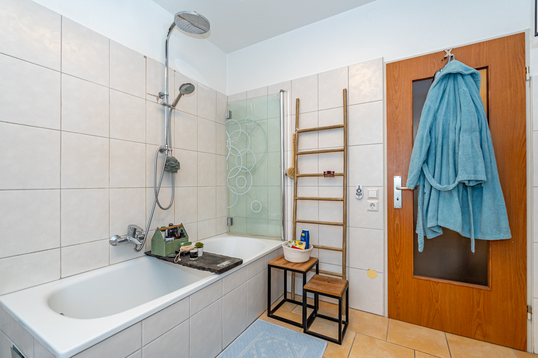Bad mit Tageslicht Das Badezimmer ist mit Fenster ausgestattet und funktional gestaltet. Eine Badewanne mit Duschmöglichkeit, wandhohe Fliesen in hellen Tönen sowie ein Waschtischbereich bieten eine solide Basis für den Start in den Tag und entspannte Abendroutinen.