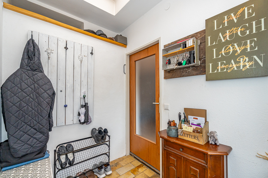 Ankommen und Alltag organisieren Der Zugang erfolgt über eine kleine, erhöhte Terrasse vor dem Haus, die sich als praktischer Platz für einen Kaffee am Morgen oder als grüner Empfang mit Kübeln und Pflanzen anbietet. Von hier geht es in den Eingangsbereich mit Treppenhaus. Die geschwungene Holztreppe mit Teppichauflagen verbindet die Ebenen und sorgt für einen kompakten, gut nutzbaren Grundriss.