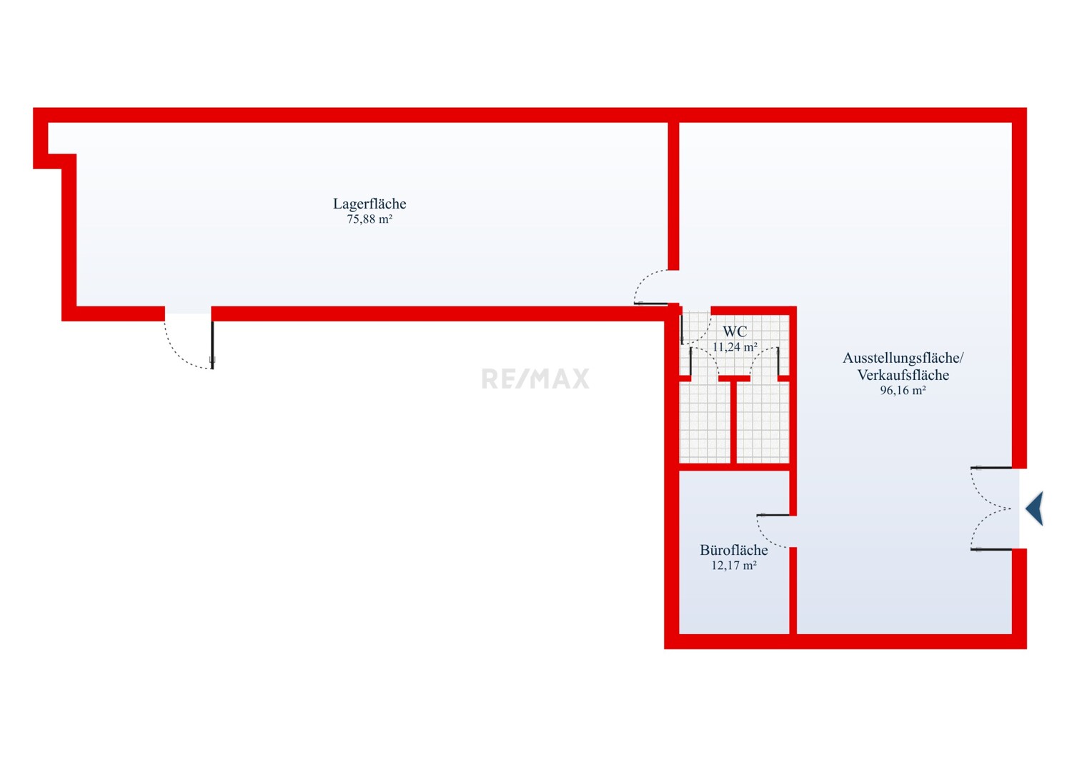 # Großzügige Fläche: ca. 100 m² Ausstellungs-/ Verkaufsfläche plus ca. 100 m² Büro- und Lagerfläche und WC