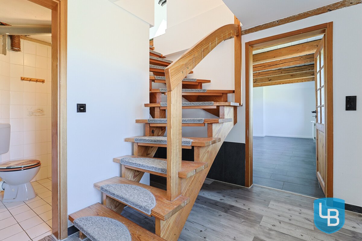 Bereits beim Betreten empfängt Sie eine offene Holztreppe, die die Ebenen elegant miteinander verbindet und den wohnlichen Stil des Hauses unterstreicht. Die Wohnung wurde modernisiert und verbindet gekonnt zeitgemäßen Wohnkomfort mit dem Charme vergangener Zeiten.