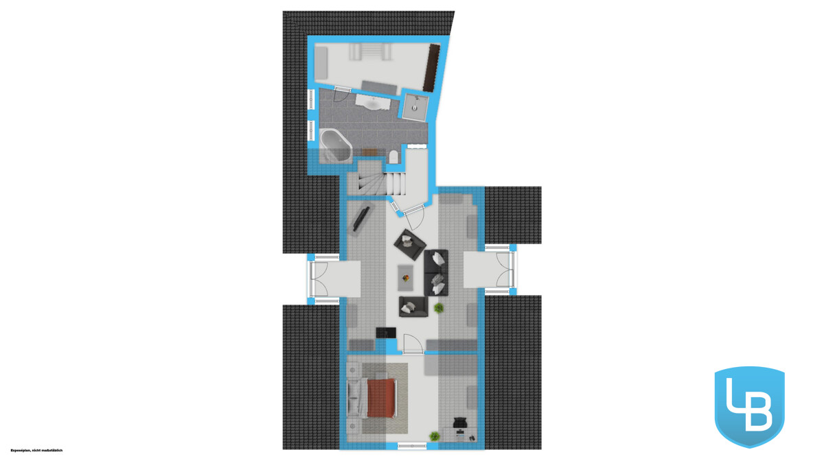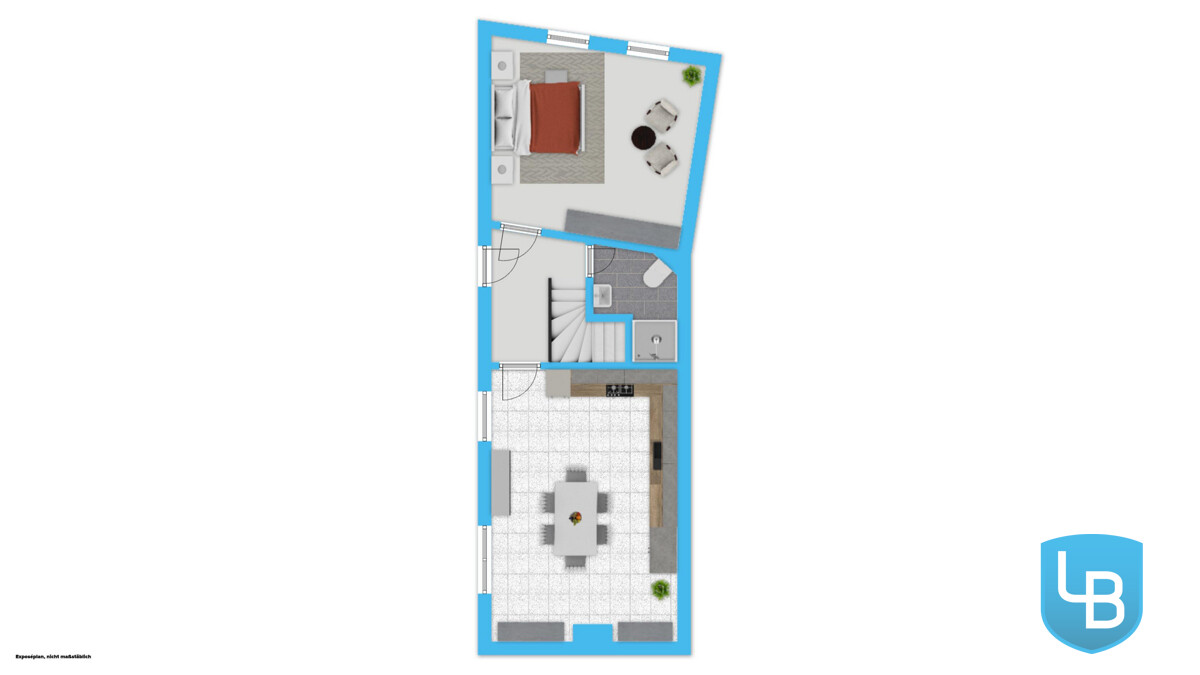 Der Wohnraum erstreckt sich über das Erdgeschoss und das Dachgeschoss und bietet ein Wohngefühl, das Individualität und Rückzug perfekt vereint. Der eigene Hauseingang sorgt für Privatsphäre und unterstreicht den Haus-im-Haus-Charakter – ideal für Paare, die ihren persönlichen Rückzugsort schätzen.