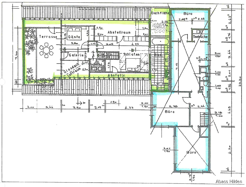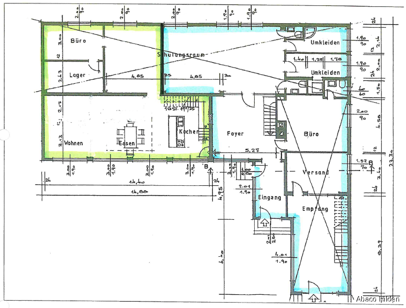 Die angebotene leerstehende Gewerbeimmobilie mit einem extravaganten Wohn-Loft ist 1968 für einen Druckereibetrieb erbaut worden. Ein Teilbereich des Seitentrakts wurde Mitte 2002 durch eine Nutzungsänderung zu Wohnzwecken (ca. 221 m²) genehmigt und zu einem exclusiven Wohn-Loft umgebaut. Dieses Wohn-Loft wurde von dem früheren Eigentümer selbst bewohnt. Die restliche Gewerbe- und Bürofläche mit ca. 368 m² im Hauptteil diente als Ausstellungs- und Handelsfläche (s. Grundrisse). Die Immobilie ist teilunterkellert. Neben dem Gebäude wurden zwei Garagen und drei Stellplätze errichtet, getrennt von einem kleinen Biotop. Bei einer Neuvermietung ist die Jahresmiete kalkulatorisch mit € 63.000,-- angesetzt worden (Wohnen/Arbeiten € 5.000,-- und 5 Parkflächen mit € 250,-- pro Monat). Die Grundstücksgröße beträgt 617 m². Laut BORIS NRW beträgt der Bodenrichtwert in diesem Bereich der City € 600 m².