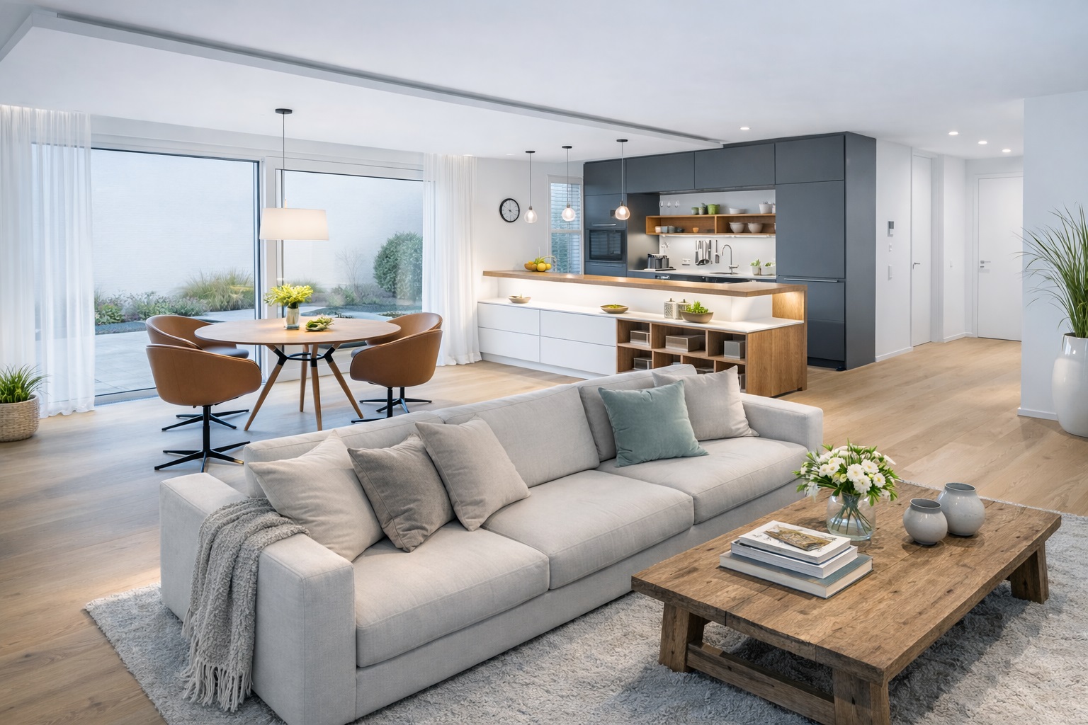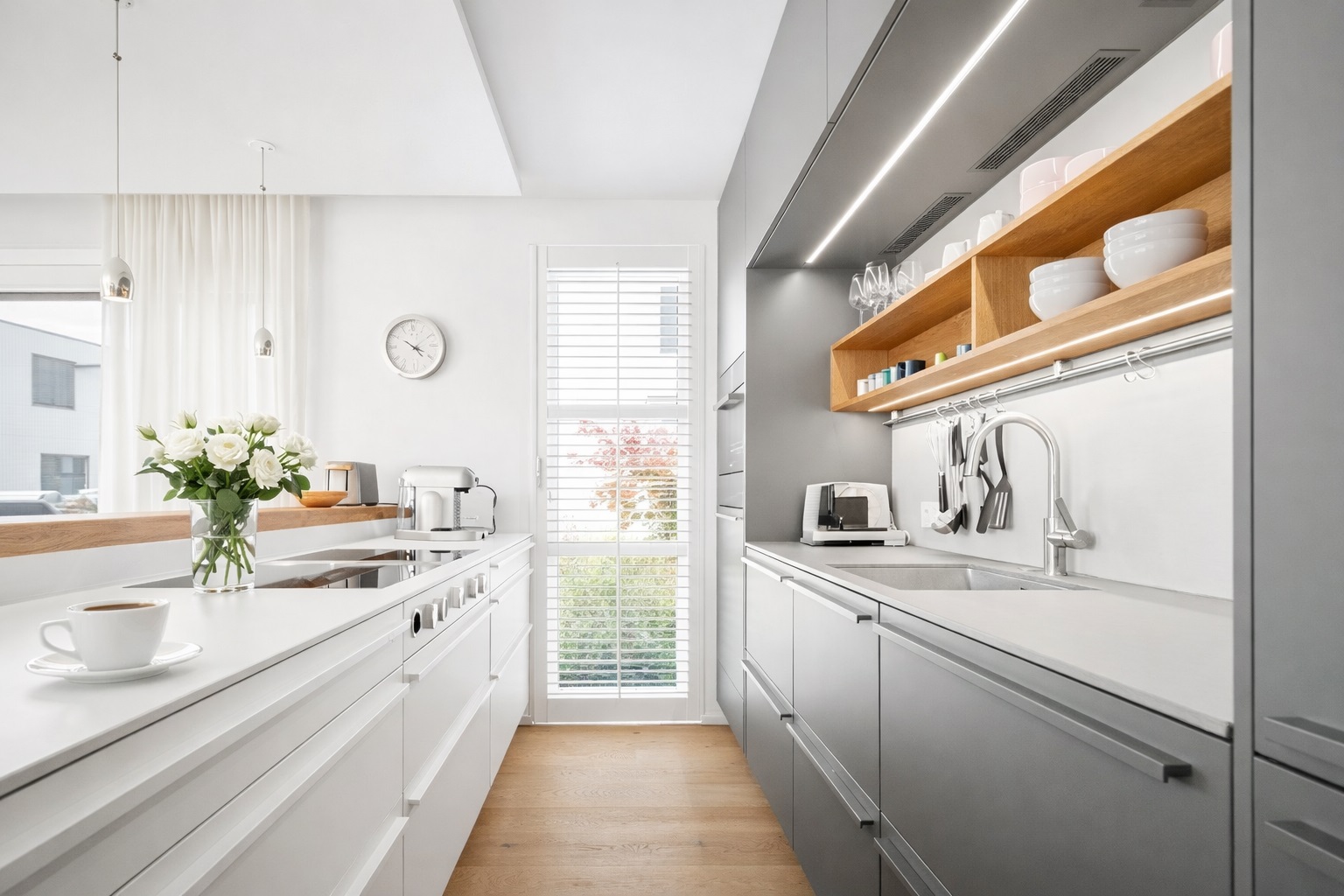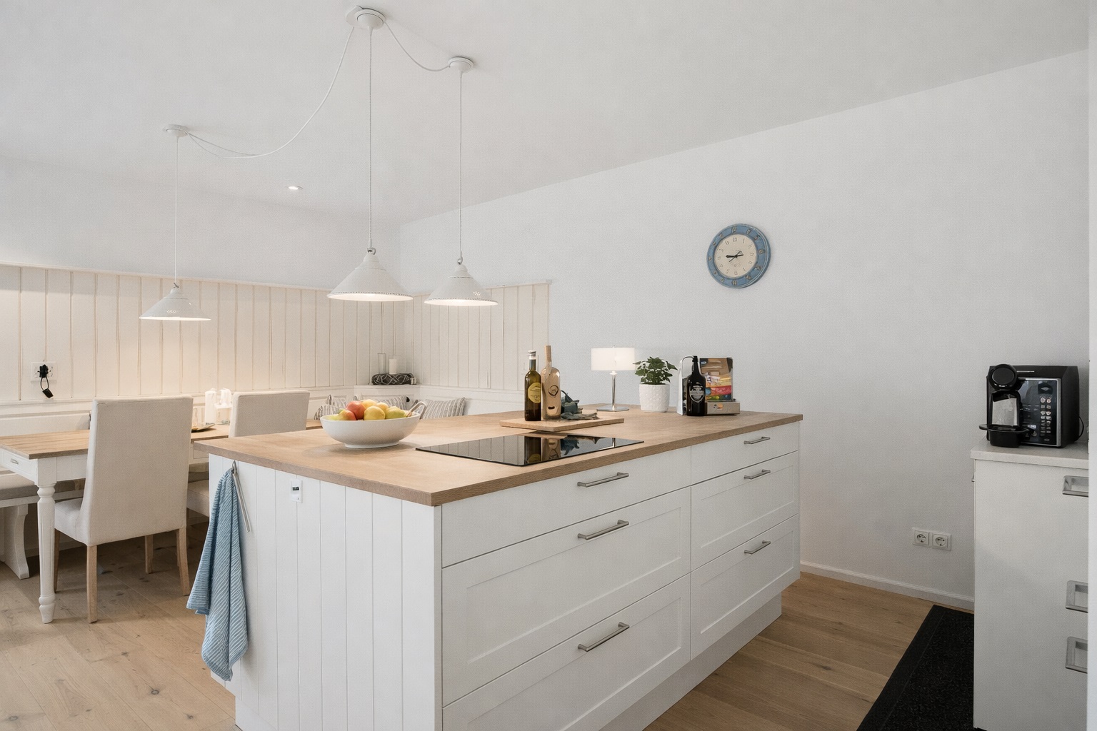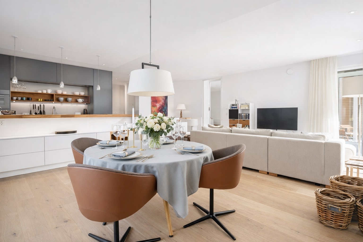 Bei der Ausstattung wurde besonderen Wert auf hochwertigste Materialien und klare Linien gelegt, die in dezenter Zurückhaltung eine behagliche Atmosphäre und ein besonders angenehmes Wohngefühl vermitteln. Der Boden ist mit edlen Eichenholzparkett ausgelegt. Die maßgefertigte Küche von G. Wurst erfüllt mit modernen Geräten und raffinierten Details höchste Ansprüche an Design und Funktionalität und fügt sich perfekt in das Gesamtkonzept des Interieurs ein.