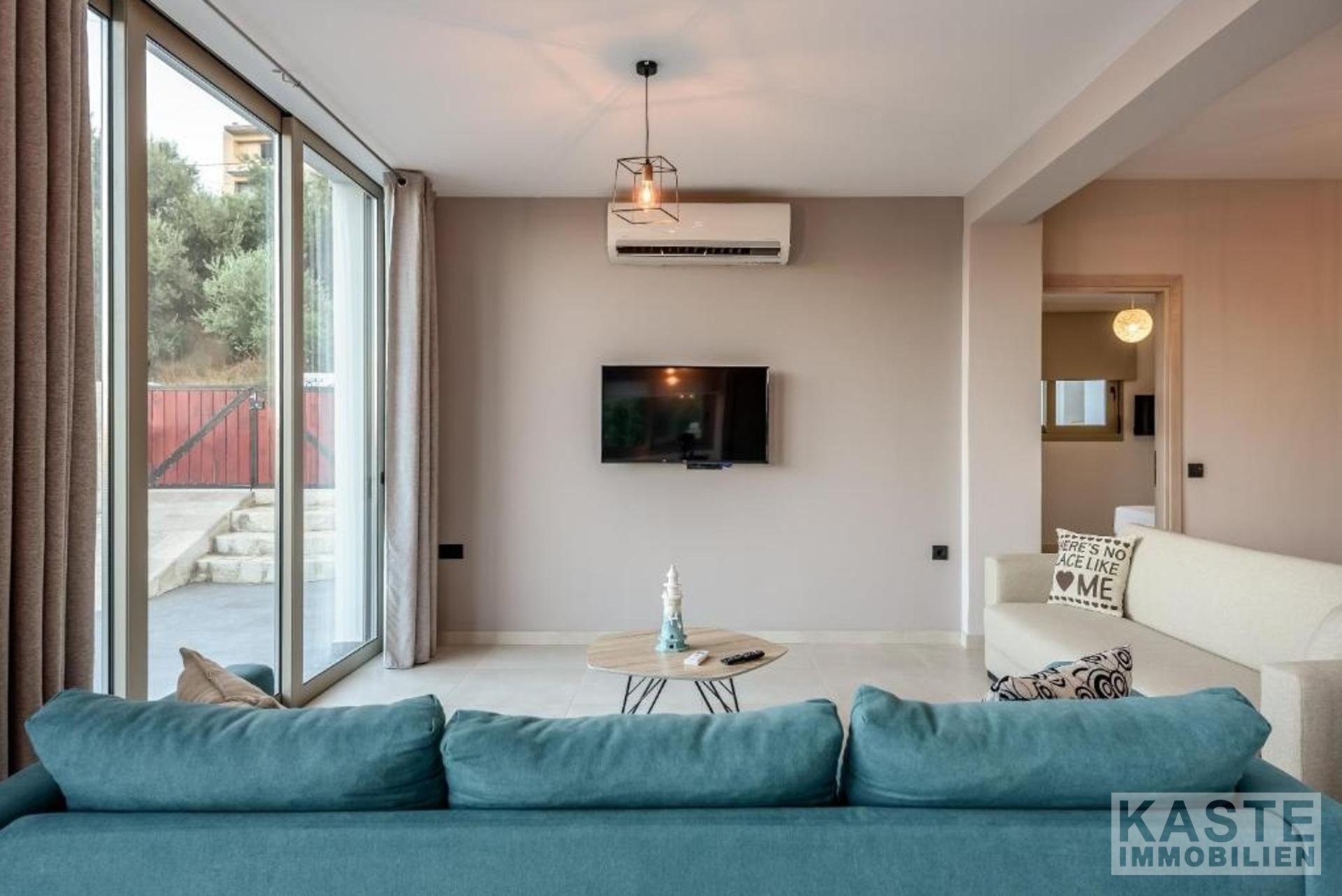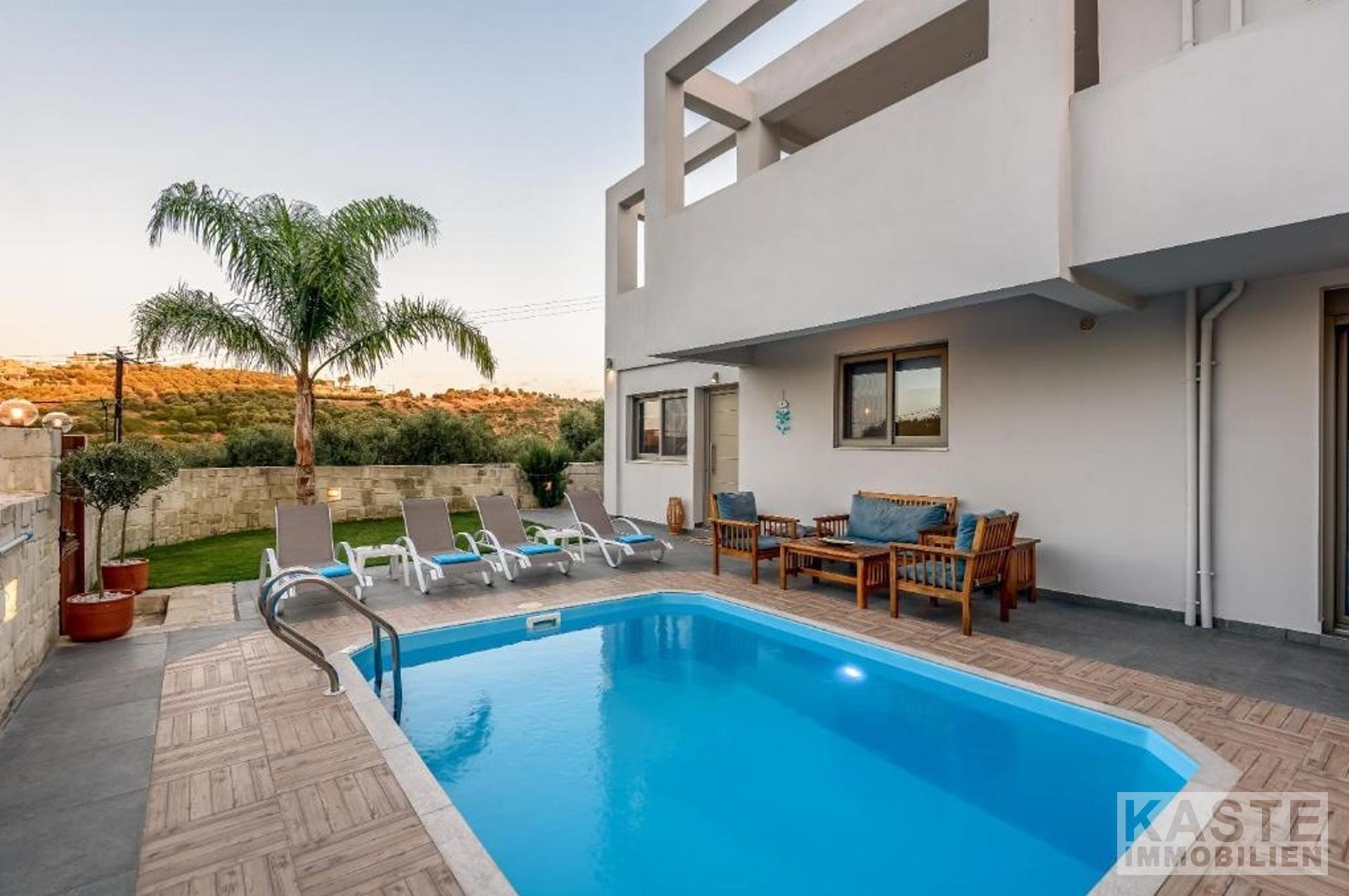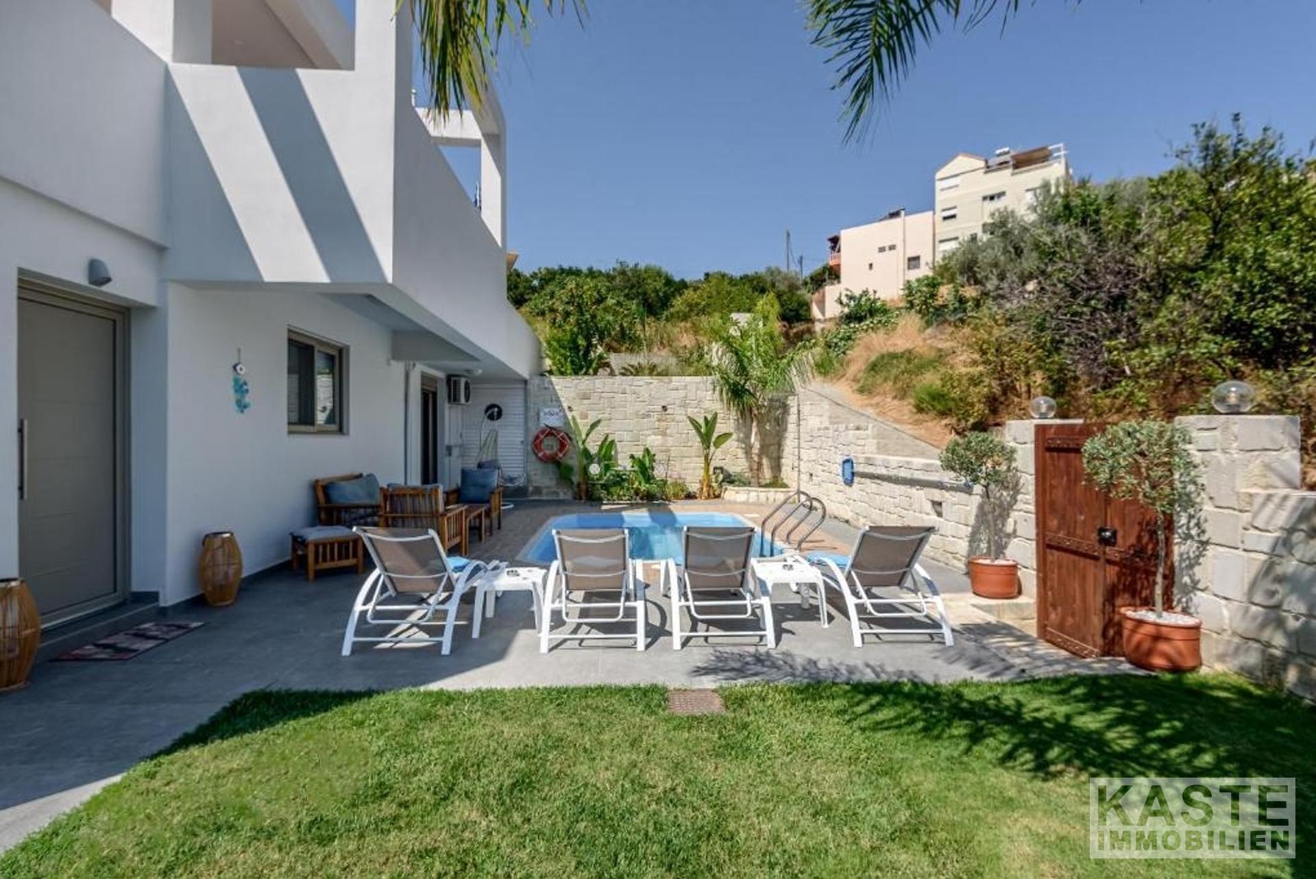 Der eingezäunte Garten mit privatem Swimmingpool, Sonnenbereich und einem Essbereich im Freien bietet Ihnen perfekte Voraussetzungen für Entspannung unter der kretischen Sonne – mit einem atemberaubenden Panorama auf das Meer und spektakuläre Sonnenuntergänge.