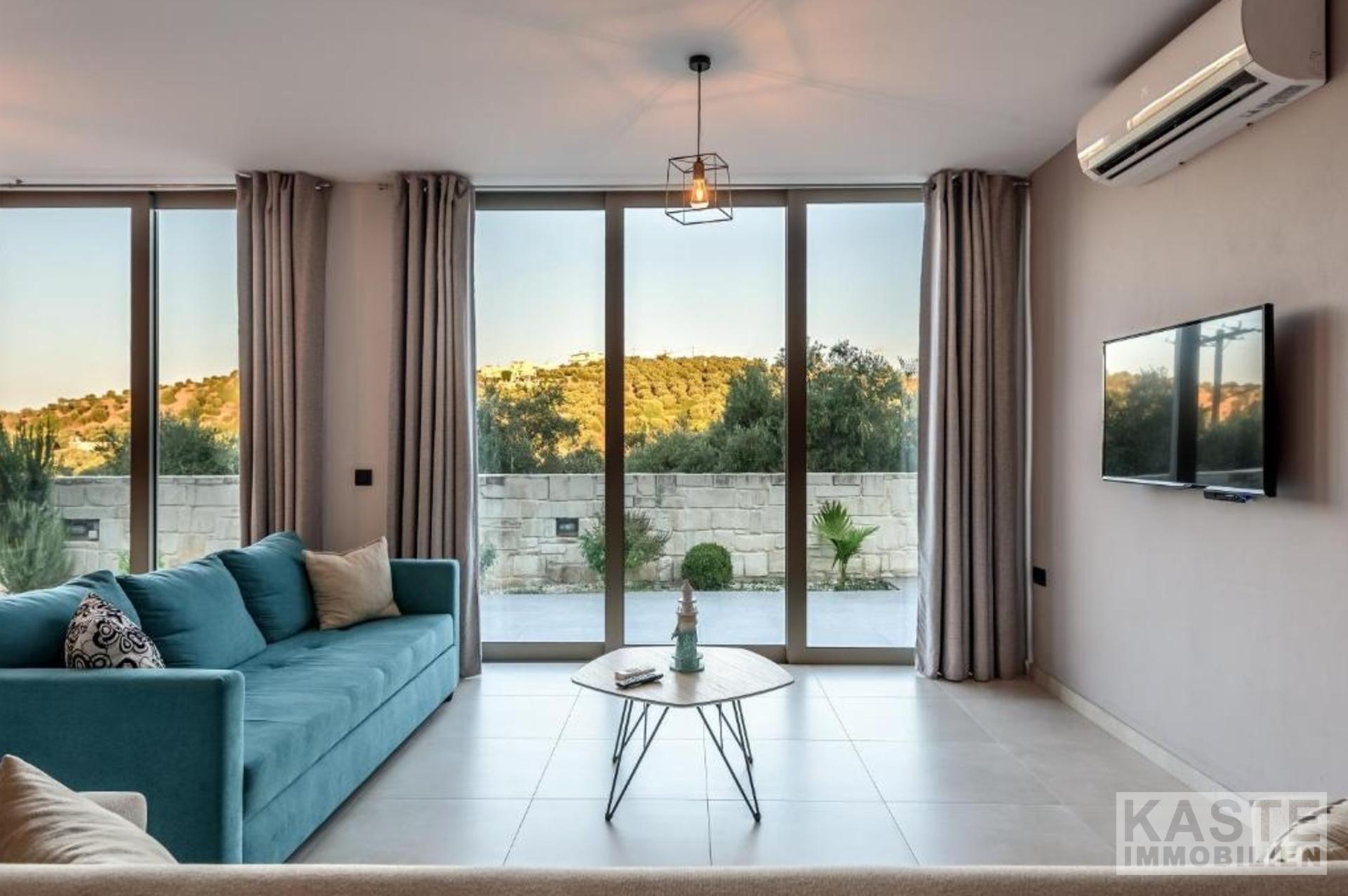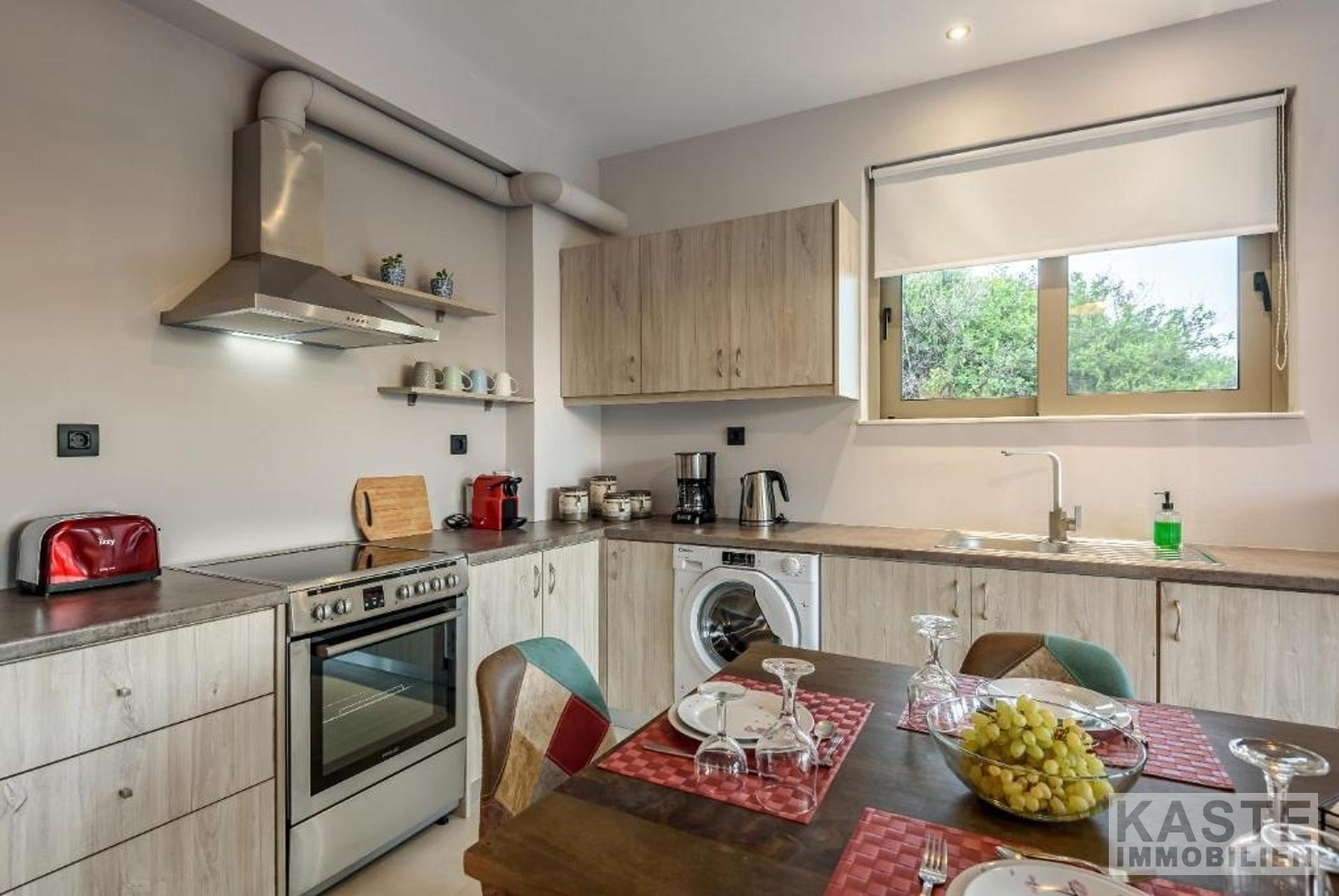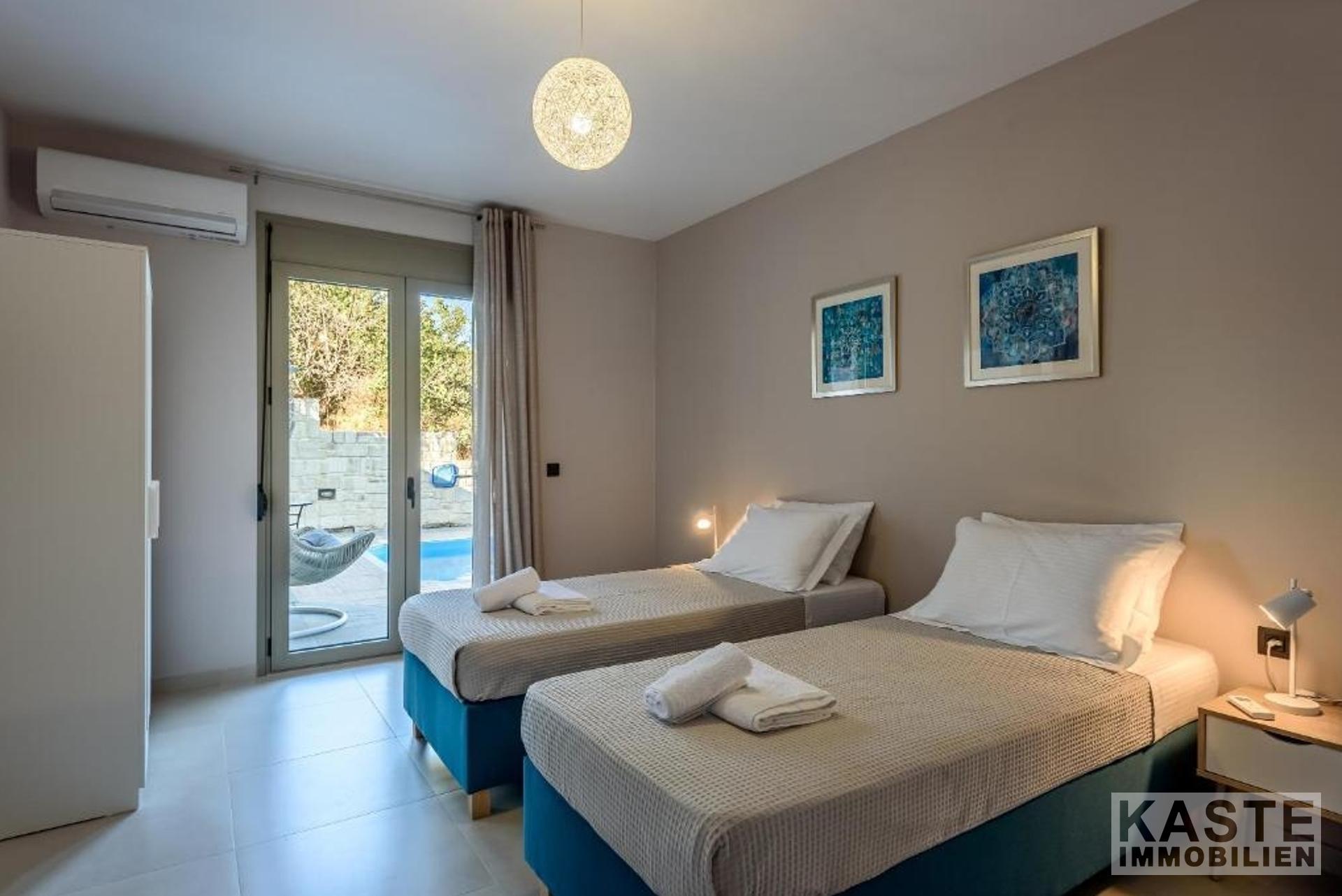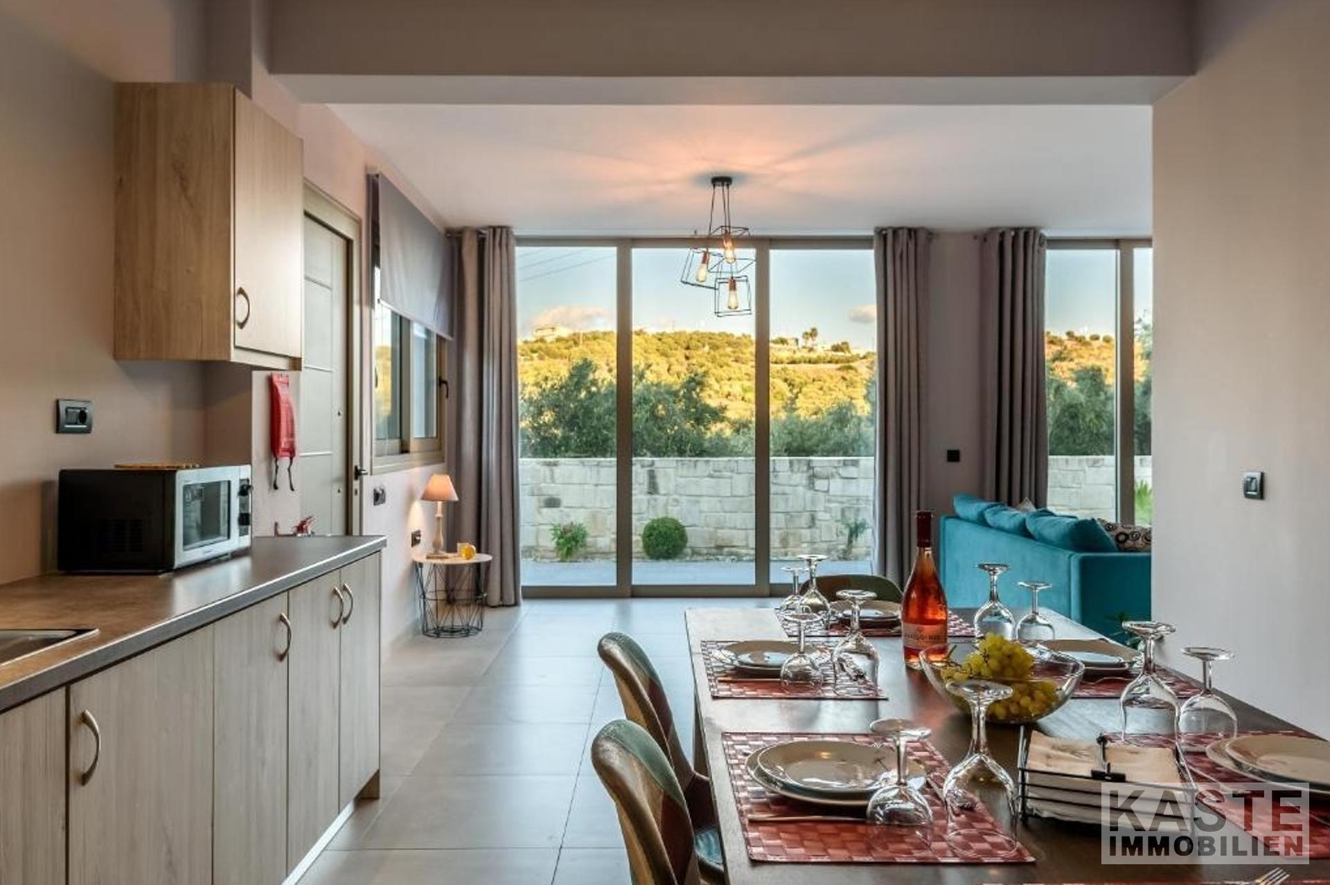 Der eingezäunte Garten mit privatem Swimmingpool, Sonnenbereich und einem Essbereich im Freien bietet Ihnen perfekte Voraussetzungen für Entspannung unter der kretischen Sonne – mit einem atemberaubenden Panorama auf das Meer und spektakuläre Sonnenuntergänge.
