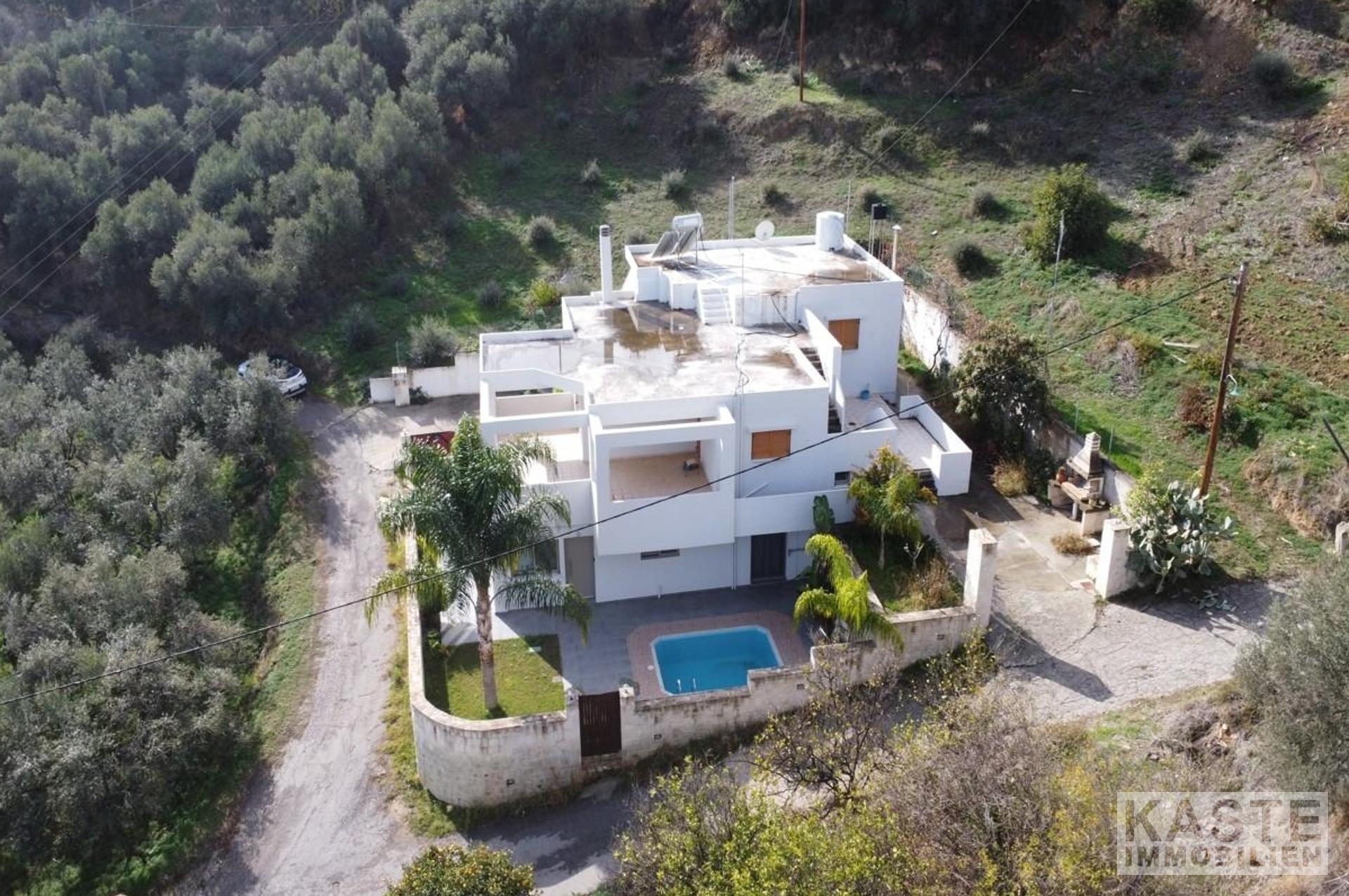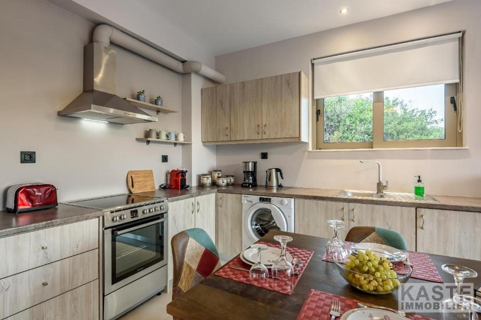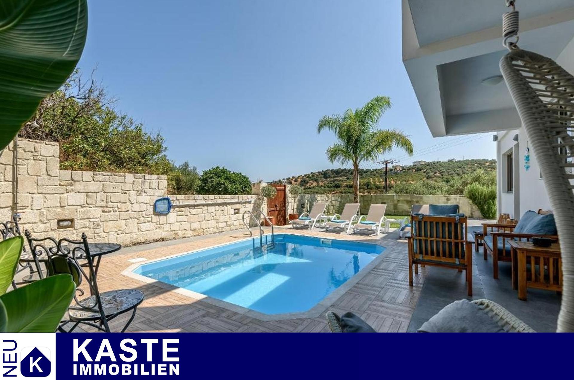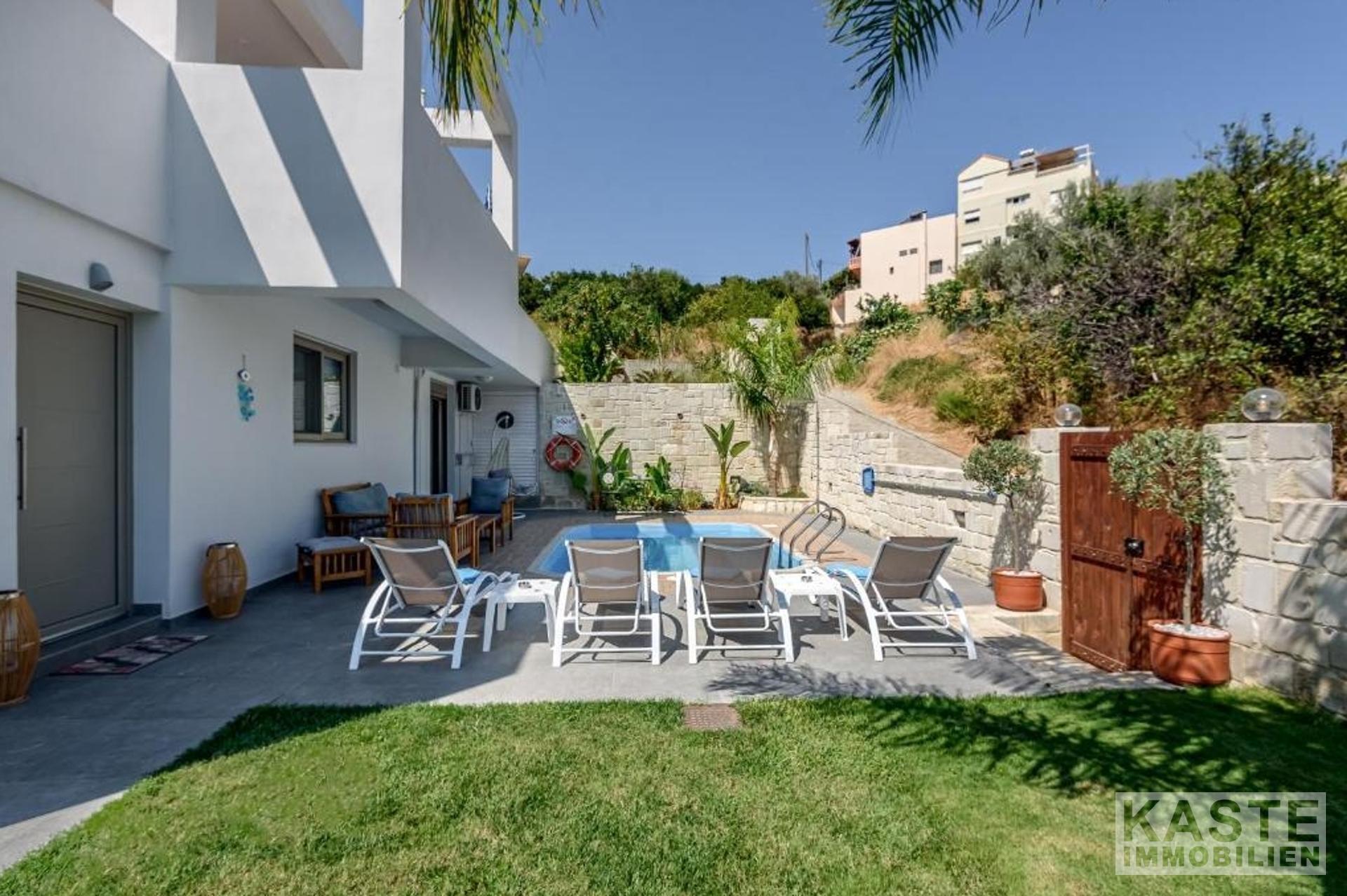 Der eingezäunte Garten mit privatem Swimmingpool, Sonnenbereich und einem Essbereich im Freien bietet Ihnen perfekte Voraussetzungen für Entspannung unter der kretischen Sonne – mit einem atemberaubenden Panorama auf das Meer und spektakuläre Sonnenuntergänge.