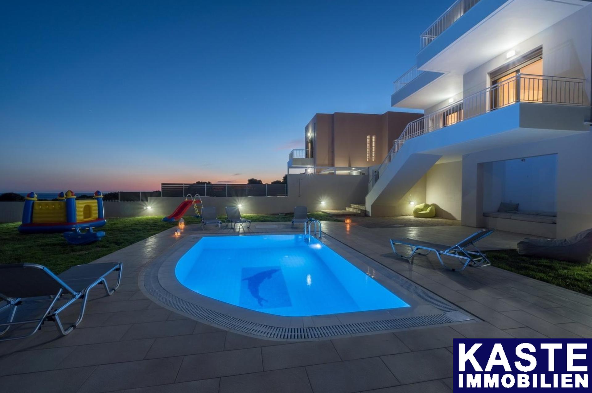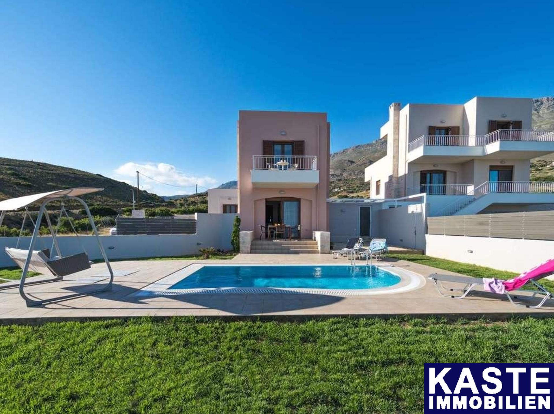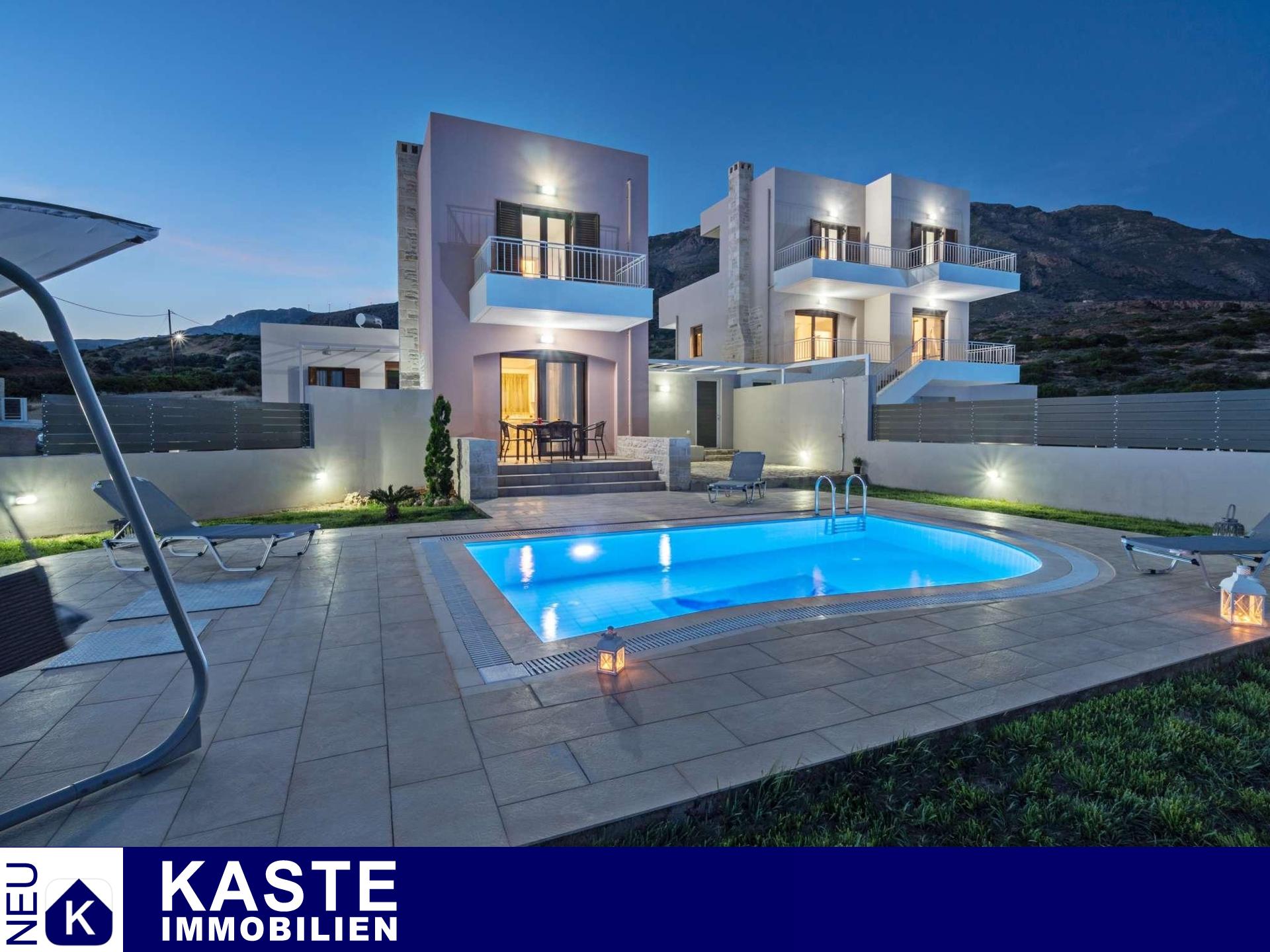 Luxuriöse Villen zum Verkauf in Triopetra Rethymnon. Das Anwesen besteht aus zwei Villen und einem Bungalow, alle voll möbliert und ausgestattet. Sie sind auf einem 4000 qm großen Grundstück auf einem Hügel und 500 m vom berühmten Strand von Triopetra entfernt gebaut und bieten einen herrlichen Blick auf das Meer, die weitere Umgebung und das Libysche Meer. Die erste Villa ist 186 qm groß und auf 3 Ebenen gebaut. Auf der ersten Ebene befindet sich ein großer Raum, der derzeit als Lager genutzt wird. Die zweite Ebene besteht aus einem einzigen Wohnzimmer mit Küche, einem Schlafzimmer und einem Badezimmer. Auf der dritten Ebene befinden sich 3 Schlafzimmer und ein Badezimmer. Draußen verfügt das Anwesen über einen großen Garten und einen privaten Pool. Die zweite Villa ist eine Maisonette von 83 qm. Im Erdgeschoss gibt es einen einzigen Raum mit einer Küche - Wohnzimmer und einem Badezimmer. In der ersten Etage befinden sich 2 Schlafzimmer und ein Badezimmer. Draußen gibt es einen privaten Pool und einen Garten. Der Bungalow ist 42 qm groß und hat ein Schlafzimmer und ein Badezimmer. Draußen gibt es eine private Terrasse und einen kleinen Garten. Das Anwesen kann entweder für den persönlichen Gebrauch als Ferienhaus oder für die professionelle Nutzung genutzt werden, da es immer noch als Tourismusunternehmen betrieben wird.