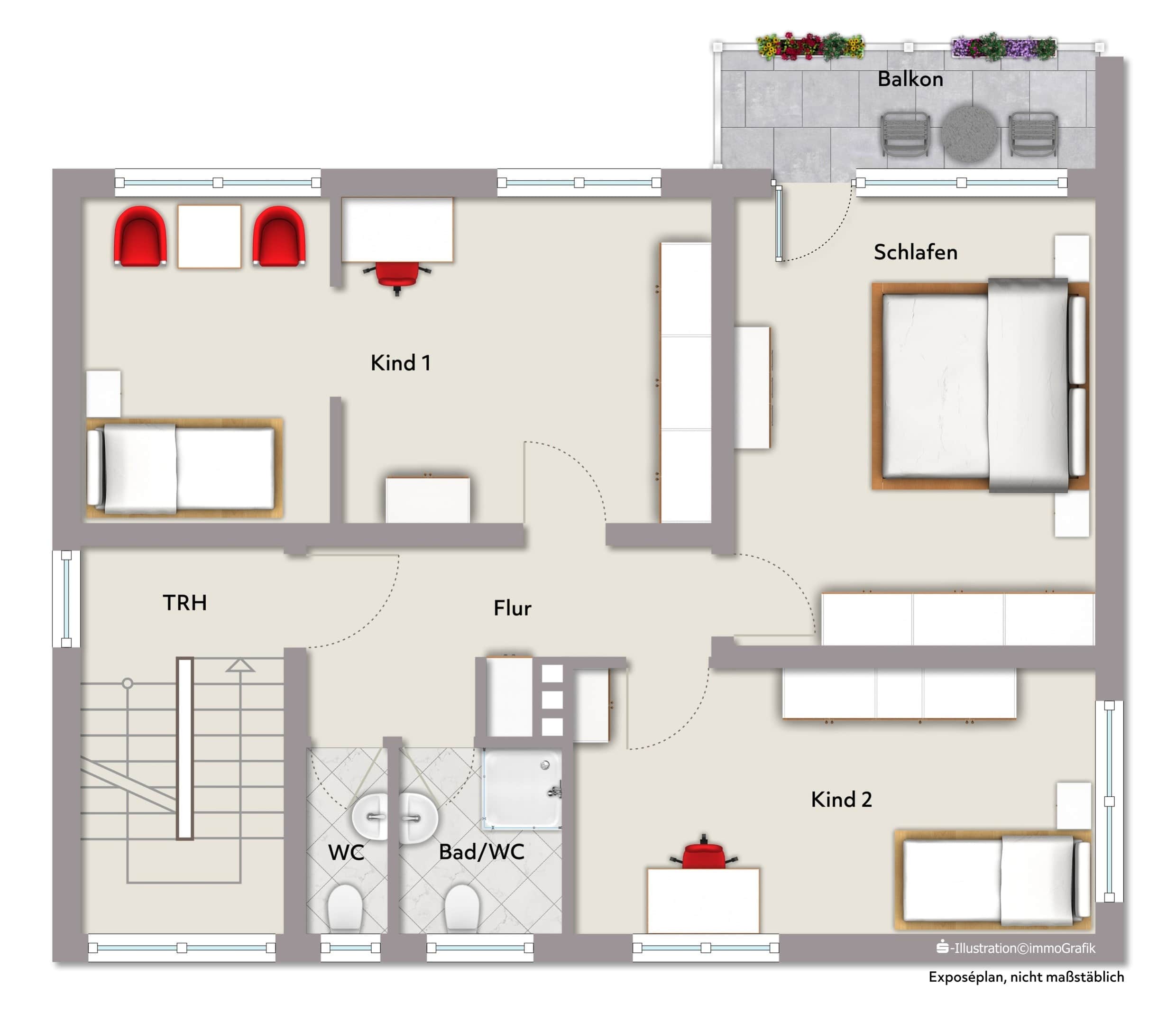 Das Obergeschoss bietet mit insgesamt drei Schlafzimmern vielseitige Nutzungsmöglichkeiten, egal ob als Kinder-, Arbeits- oder Gästezimmer. Eines der Zimmer gewährt Zugang zu einem Balkon und schafft einen angenehmen Rückzugsort im Freien. Ergänzt wird diese Etage durch ein Duschbad mit Dusche und Waschtisch sowie ein separates WC . Im Jahr 2011 wurden neue Innentüren eingesetzt und die Heizkörper inklusive Thermostatventilen erneuert. Das Badezimmer verfügt zusätzlich über eine Fußbodenheizung. Kleinere Renovierungsarbeiten könnten das Obergeschoss an moderne Wohnstandards anpassen und indiviudell aufwerten.