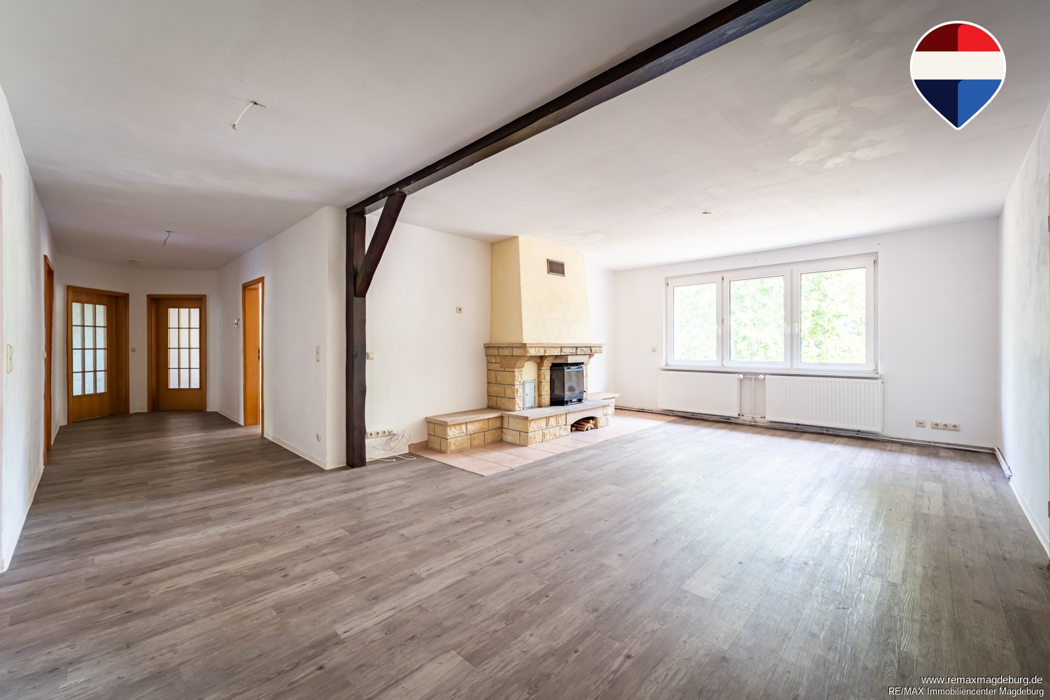 Die rechte Wohneinheit umfasst ca. 155 m² Wohnfläche und steht derzeit leer, wodurch sich vielfältige Nutzungsmöglichkeiten eröffnen – sei es zur Eigennutzung oder zur Vermietung. Ein besonderes Highlight ist das großzügige Wohnzimmer mit Kamin, der an kühleren Tagen für eine behagliche Atmosphäre sorgt. Das Vollbad verfügt über einen direkten Zugang zur Terrasse. Die Küche ist mit einer Einbauküche ausgestattet und bietet ebenfalls einen Zugang nach draußen. Insgesamt stehen vier weitere Zimmer zur Verfügung, die flexibel als Schlaf-, Kinder-, Arbeits- oder Gästezimmer genutzt werden können.