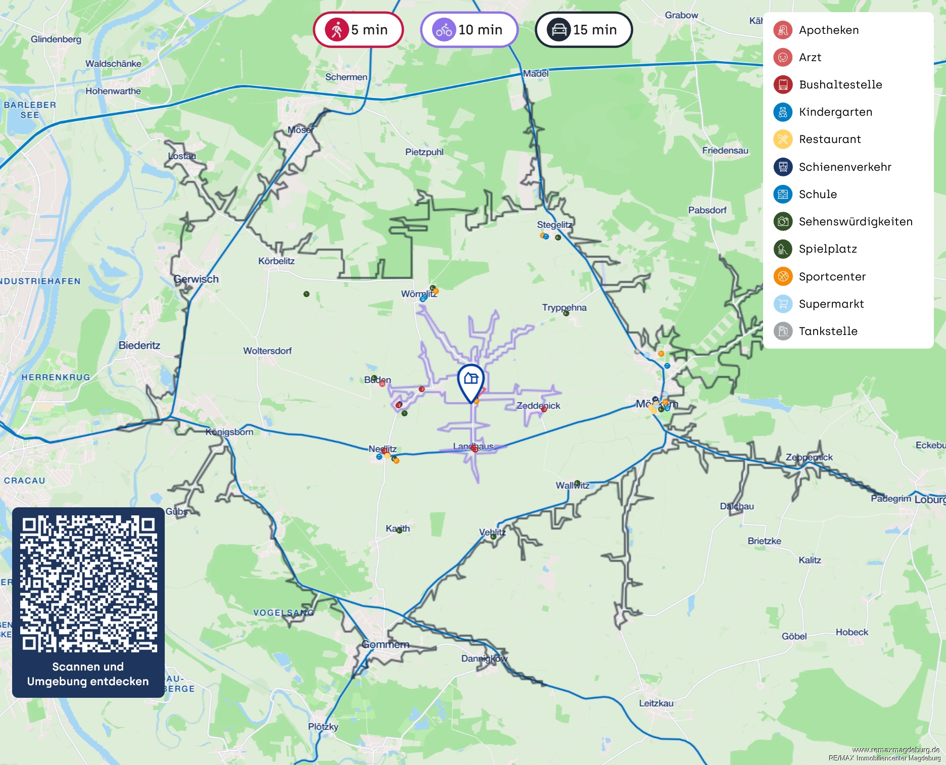 Trotz der naturnahen Lage ist die verkehrstechnische Anbindung sehr gut. Über die nahegelegene Bundesstraße B246 ist die Stadt Möckern in wenigen Minuten erreichbar, und auch Burg sowie Magdeburg sind mit dem Auto bequem in rund 20 bis 30 Minuten zu erreichen. Die Autobahn A2 liegt nur wenige Kilometer entfernt und bietet eine schnelle Verbindung in Richtung Berlin oder Hannover – ideal für Pendler. Eine Bushaltestelle befindet sich im Ort und bietet regelmäßige Verbindungen zu den umliegenden Gemeinden. Auch der nächstgelegene Bahnhof mit Anschluss an den Regionalverkehr ist in kurzer Fahrzeit erreichbar und ermöglicht eine gute Anbindung an den öffentlichen Nahverkehr.