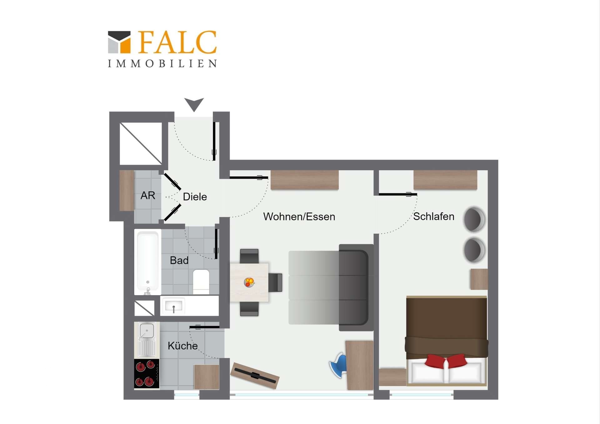 Von dem Eingangsflur mit Garderobenschrank erreichen Sie geradeaus das Badezimmer mit Wanne und WC. Linker Hand betreten Sie das geräumige Wohnzimmer, das auch Platz für einen kleinen Essbereich bietet. Hier schließt sich die kompakte Küche an. Auf der anderen Seite des Wohnbereichs befindet sich das Schlafzimmer.