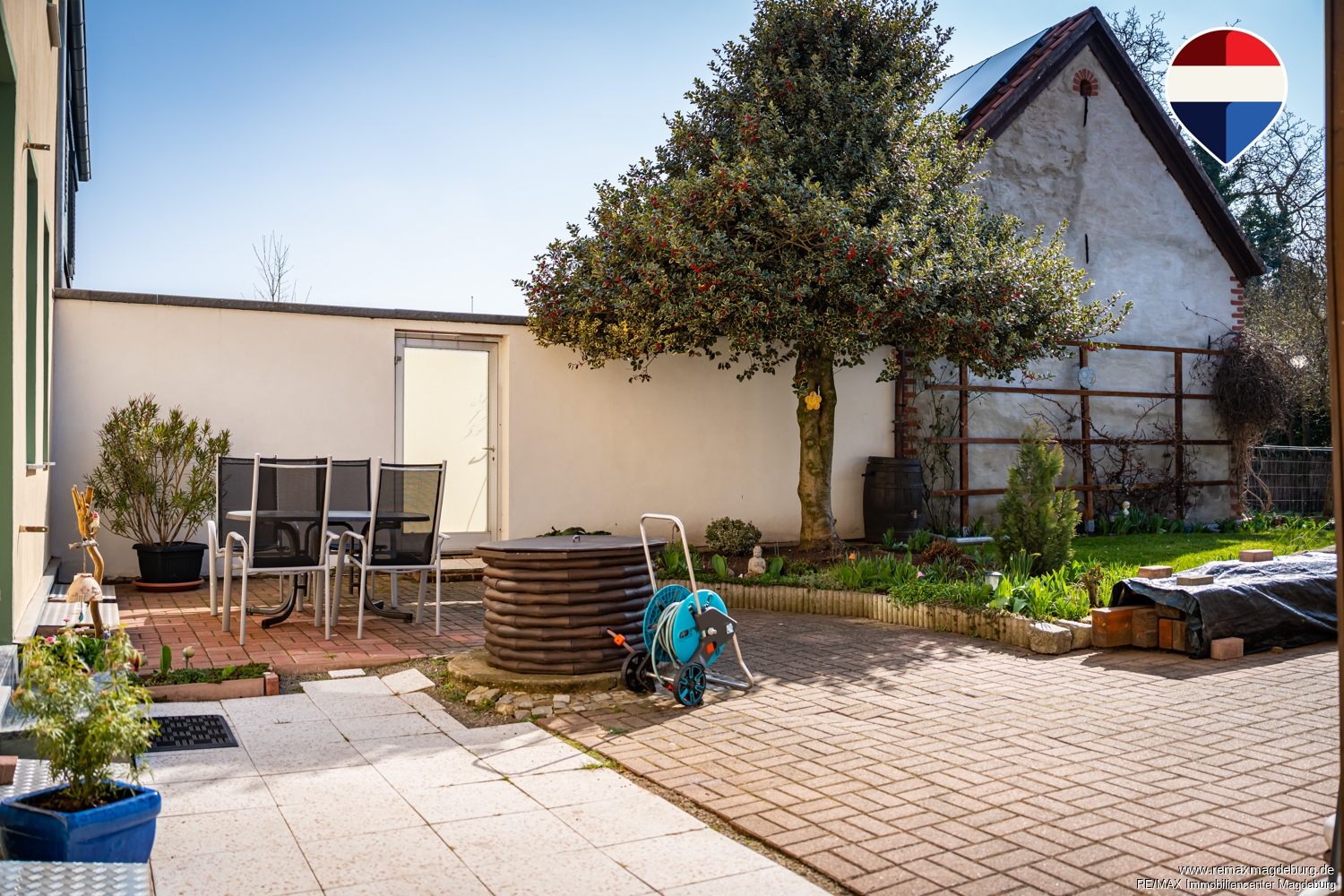 Der Außenbereich des Hauses überzeugt mit einer gepflasterten Terrassenfläche, die zu geselligen Stunden im Freien einlädt, sowie einem angrenzenden Gartenbereich, der Raum für Erholung, Spiel oder gärtnerische Gestaltung bietet.