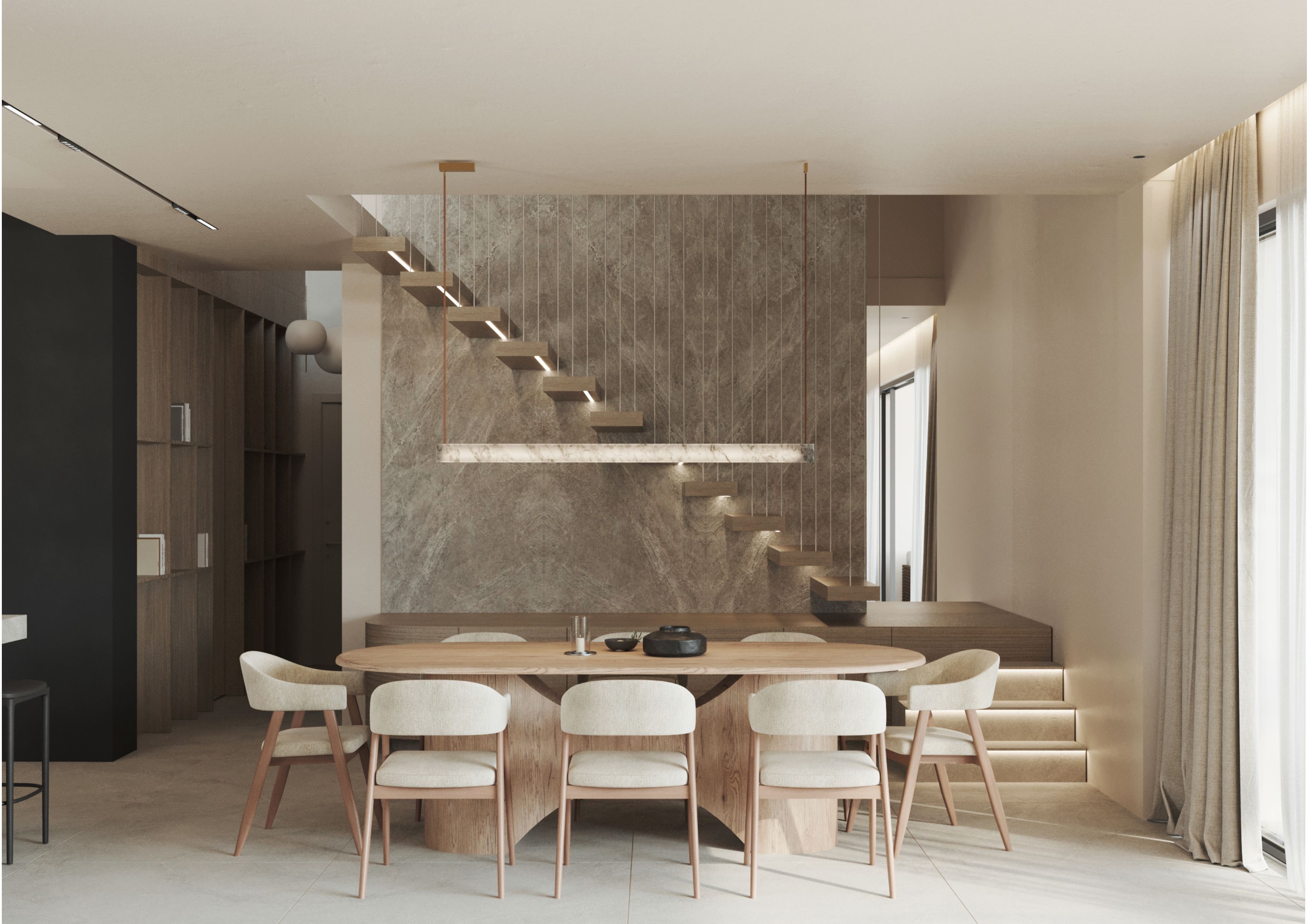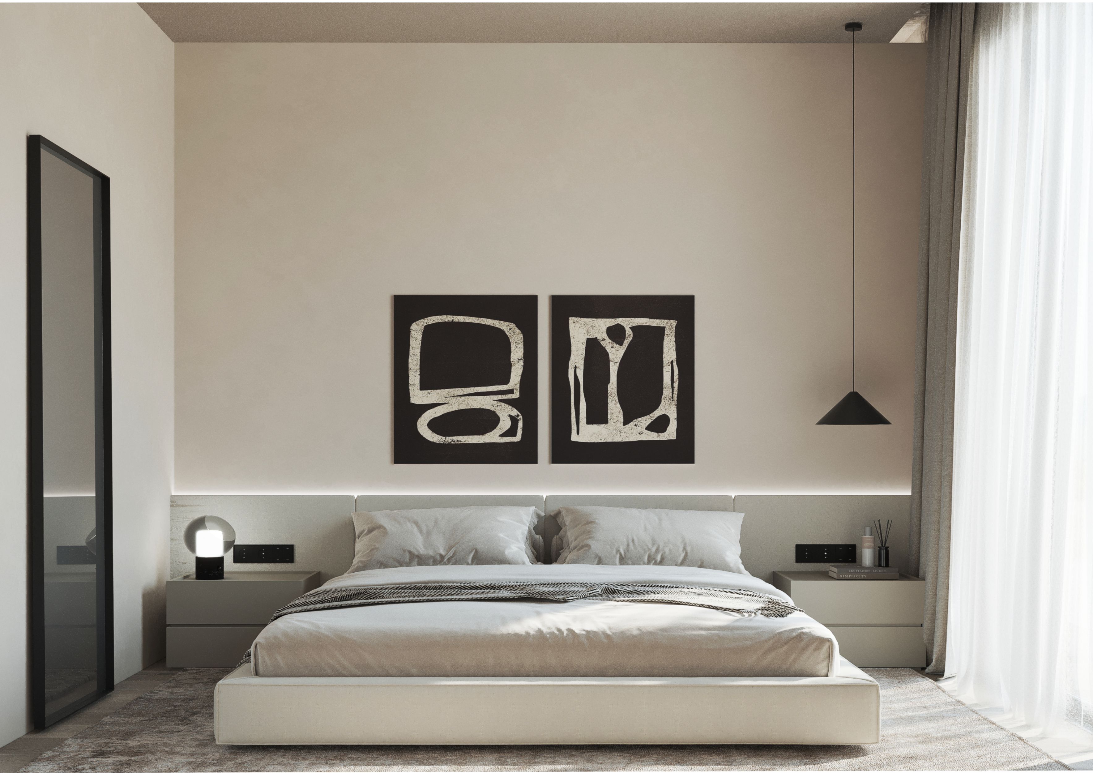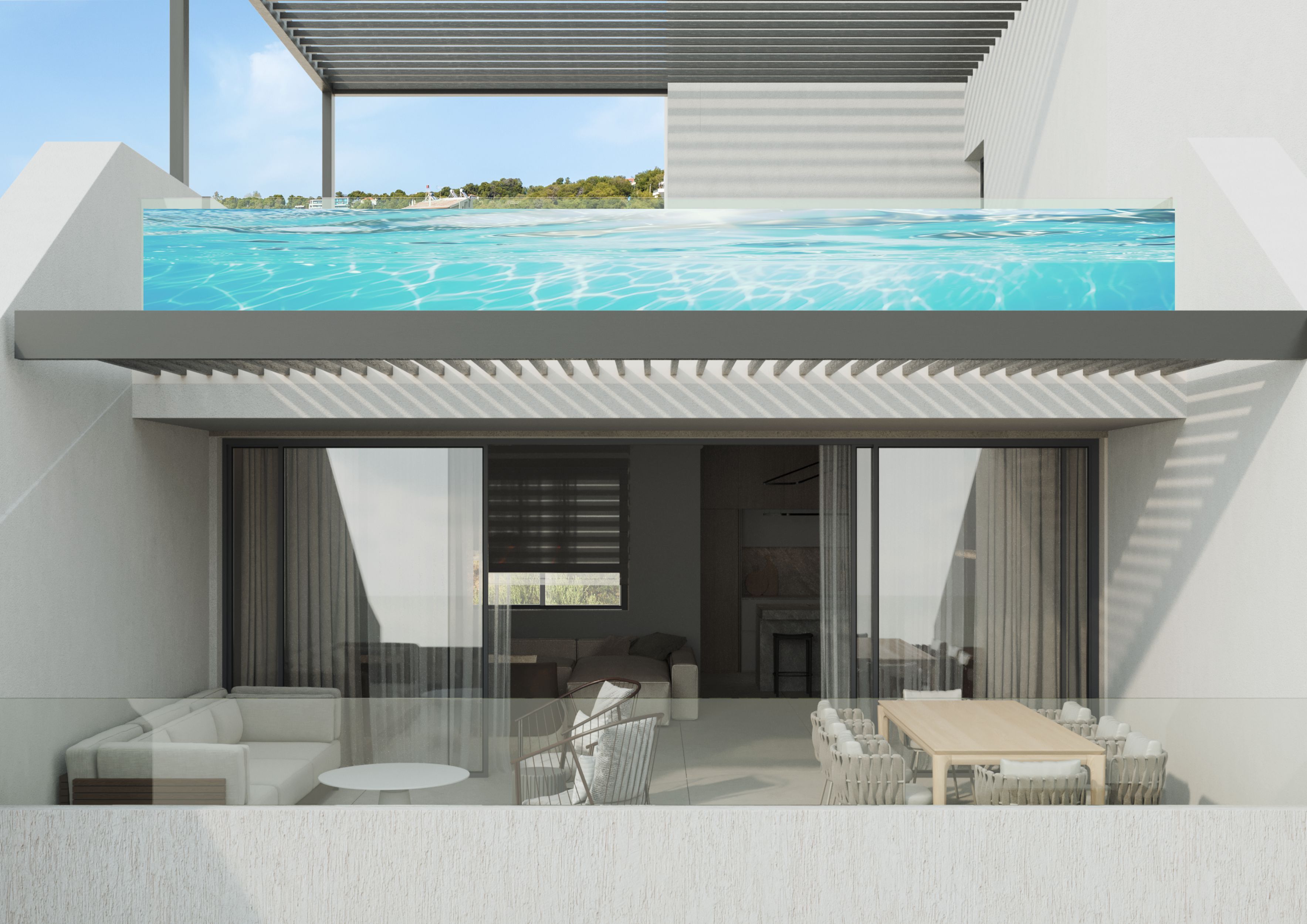 Die obere Ebene besticht durch einen großzügigen Wohnbereich mit Zugang zur Dachterrasse, einem privaten Swimmingpool (11,25 m²), einem Master Bedroom mit eigenem Bad, Ankleidebereich und einem lichtdurchfluteten Arbeitszimmer mit Galerie. Auf der unteren Etage befinden sich zwei weitere Schlafzimmer, eines davon ebenfalls mit privatem Bad und Ankleideraum, ein zusätzliches Gästebad, sowie Balkone an beiden Schlafzimmern.