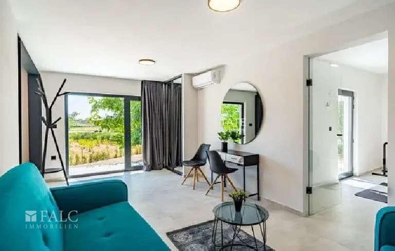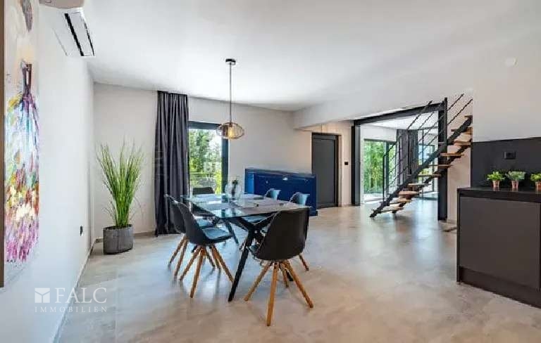 Im Erdgeschoss befindet sich ein offen gestalteter Wohnbereich mit Wohnzimmer, moderner Küche und Essbereich. Große Fensterflächen schaffen eine helle, freundliche Atmosphäre und ermöglichen einen direkten Zugang zur Terrasse sowie in den gepflegten Garten. Ein besonderes Highlight auf dieser Ebene ist das private Fitnessstudio, das ebenfalls direkten Zugang in den Außenbereich bietet. Zu den besonderen Highlights zählt der Swimmingpool mit Sonnenbereich, der zu erholsamen Stunden unter der kroatischen Sonne einlädt. Natürlichen Schatten spendet eine jahrhundertealte Eiche, die dem Außenbereich einen einzigartigen, mediterranen Charakter verleiht.