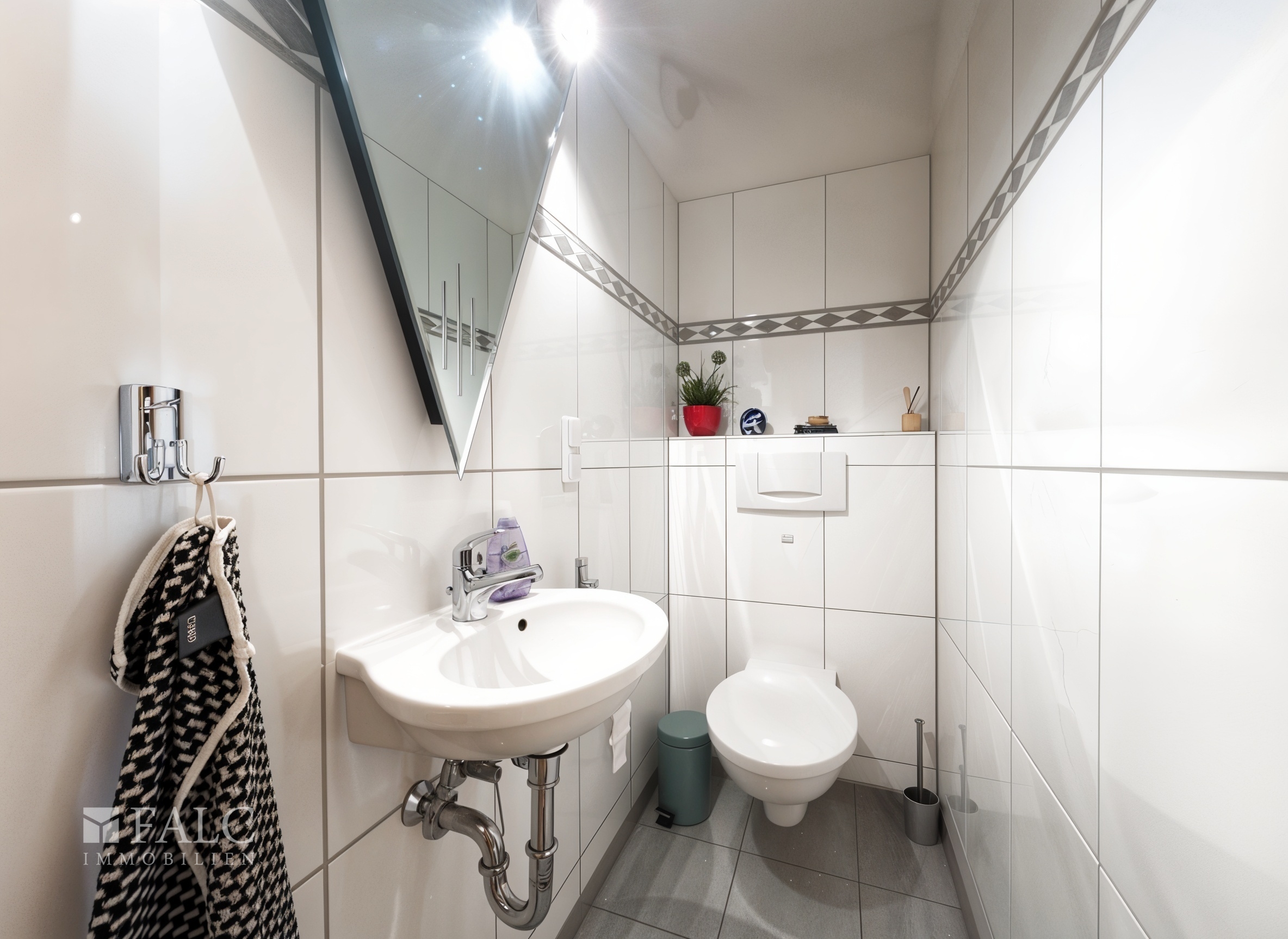 Ein besonderes Highlight ist die großzügige Terrasse mit direktem Zugang zum Garten – ideal, um sonnige Tage im Freien zu genießen oder gemütliche Abende ausklingen zu lassen. Das Badezimmer ist hochwertig ausgestattet und bietet eine Badewanne, eine große Dusche, ein Hänge-WC, ein Bidet sowie einen Doppelwaschtisch. Zusätzlich steht ein separates Gäste-WC zur Verfügung, was den Wohnkomfort weiter erhöht.
